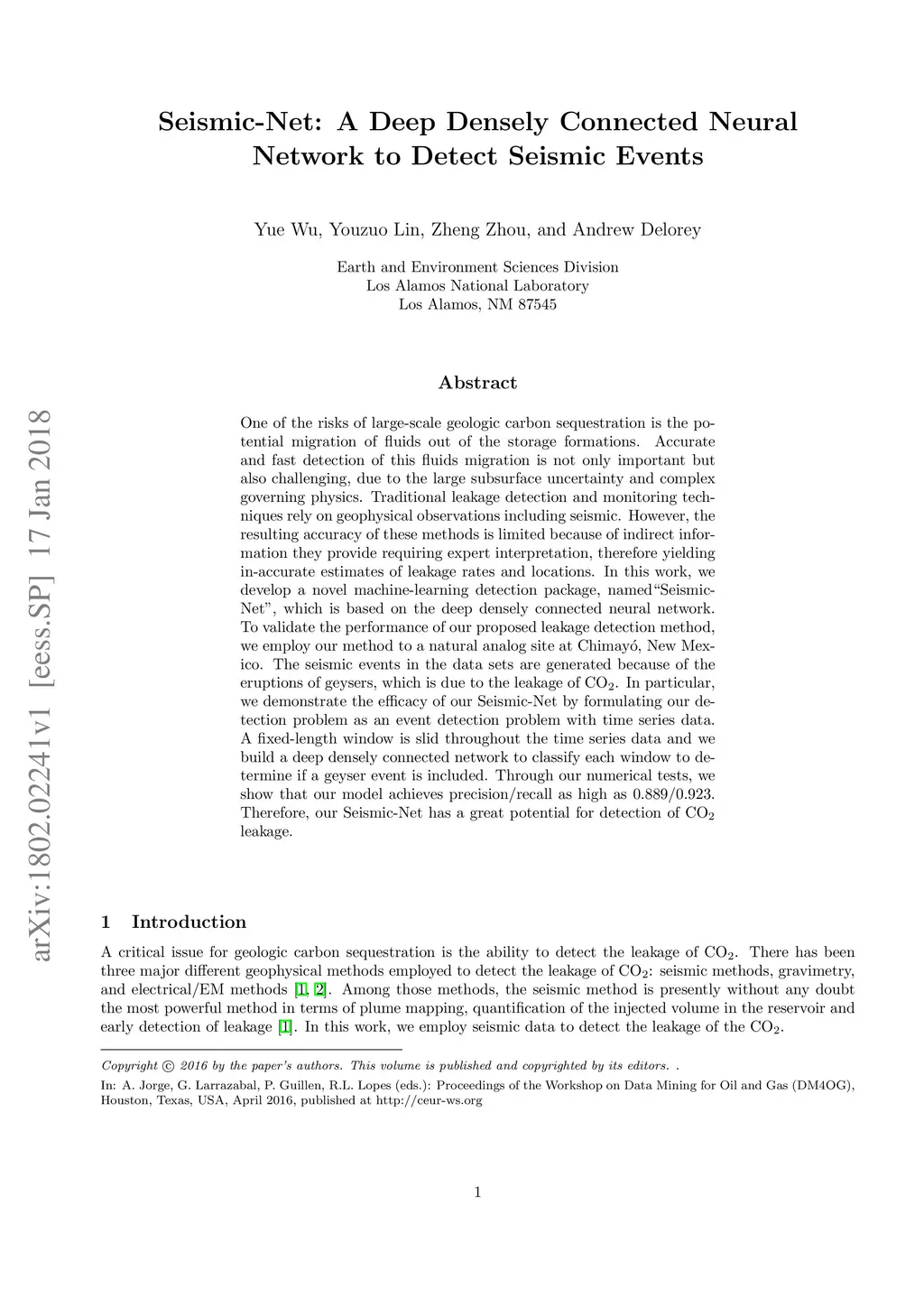 One of the risks of large-scale geologic carbon sequestration is the potential migration of fluids out of the storage formations. Accurate and fast detection of this fluids migration is not only important but also challenging, due to the large subsurface uncertainty and complex governing physics. Traditional leakage detection and monitoring techniques rely on geophysical observations including seismic. However, the resulting accuracy of these methods is limited because of indirect information they provide requiring expert interpretation, therefore yielding in-accurate estimates of leakage rates and locations. In this work, we develop a novel machine-learning detection package, named "Seismic-Net", which is based on the deep densely connected neural network. To validate the performance of our proposed leakage detection method, we employ our method to a natural analog site at Chimay\ó, New Mexico. The seismic events in the data sets are generated because of the eruptions of geysers, which is due to the leakage of . In particular, we demonstrate the efficacy of our Seismic-Net by formulating our detection problem as an event detection problem with time series data. A fixed-length window is slid throughout the time series data and we build a deep densely connected network to classify each window to determine if a geyser event is included. Through our numerical tests, we show that our model achieves precision/recall as high as 0.889/0.923. Therefore, our Seismic-Net has a great potential for detection of leakage.
