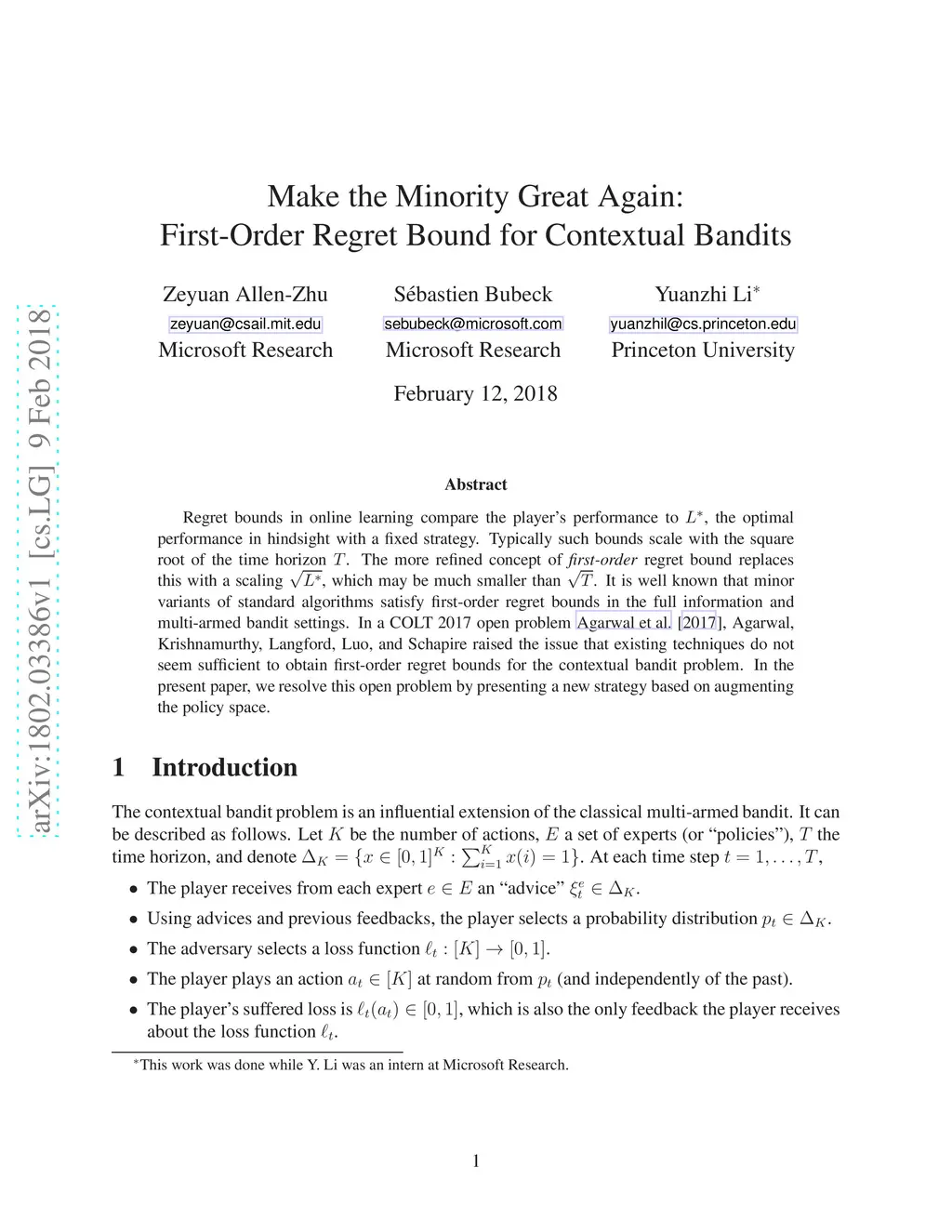 Make the Minority Great Again: First-Order Regret Bound for Contextual