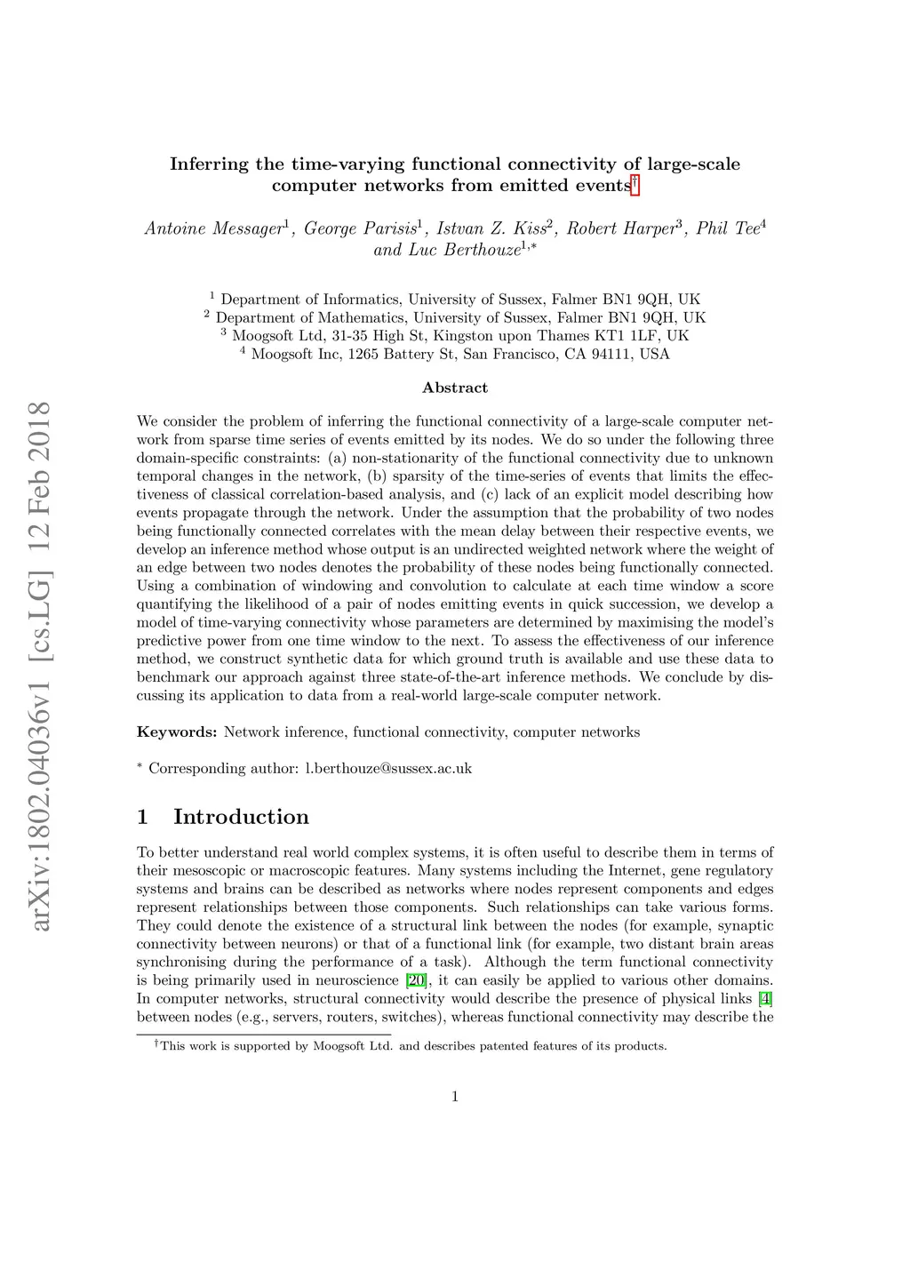 We consider the problem of inferring the functional connectivity of a large-scale computer network from sparse time series of events emitted by its nodes. We do so under the following three domain-specific constraints: (a) non-stationarity of the functional connectivity due to unknown temporal changes in the network, (b) sparsity of the time-series of events that limits the effectiveness of classical correlation-based analysis, and (c) lack of an explicit model describing how events propagate through the network. Under the assumption that the probability of two nodes being functionally connected correlates with the mean delay between their respective events, we develop an inference method whose output is an undirected weighted network where the weight of an edge between two nodes denotes the probability of these nodes being functionally connected. Using a combination of windowing and convolution to calculate at each time window a score quantifying the likelihood of a pair of nodes emitting events in quick succession, we develop a model of time-varying connectivity whose parameters are determined by maximising the model's predictive power from one time window to the next. To assess the effectiveness of our inference method, we construct synthetic data for which ground truth is available and use these data to benchmark our approach against three state-of-the-art inference methods. We conclude by discussing its application to data from a real-world large-scale computer network.