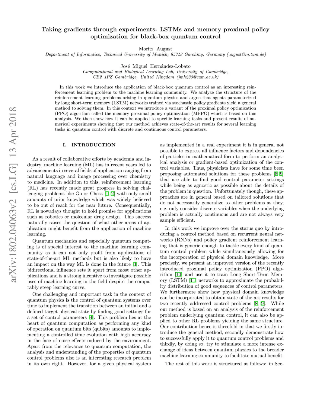 In this work we introduce the application of black-box quantum control as an interesting rein- forcement learning problem to the machine learning community. We analyze the structure of the reinforcement learning problems arising in quantum physics and argue that agents parameterized by long short-term memory (LSTM) networks trained via stochastic policy gradients yield a general method to solving them. In this context we introduce a variant of the proximal policy optimization (PPO) algorithm called the memory proximal policy optimization (MPPO) which is based on this analysis. We then show how it can be applied to specific learning tasks and present results of nu- merical experiments showing that our method achieves state-of-the-art results for several learning tasks in quantum control with discrete and continouous control parameters.