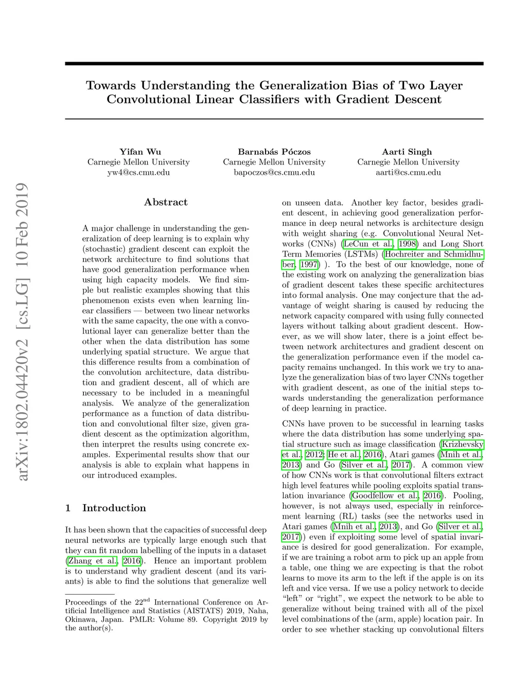 A major challenge in understanding the generalization of deep learning is to explain why (stochastic) gradient descent can exploit the network architecture to find solutions that have good generalization performance when using high capacity models. We find simple but realistic examples showing that this phenomenon exists even when learning linear classifiers --- between two linear networks with the same capacity, the one with a convolutional layer can generalize better than the other when the data distribution has some underlying spatial structure. We argue that this difference results from a combination of the convolution architecture, data distribution and gradient descent, all of which are necessary to be included in a meaningful analysis. We provide a general analysis of the generalization performance as a function of data distribution and convolutional filter size, given gradient descent as the optimization algorithm, then interpret the results using concrete examples. Experimental results show that our analysis is able to explain what happens in our introduced examples.