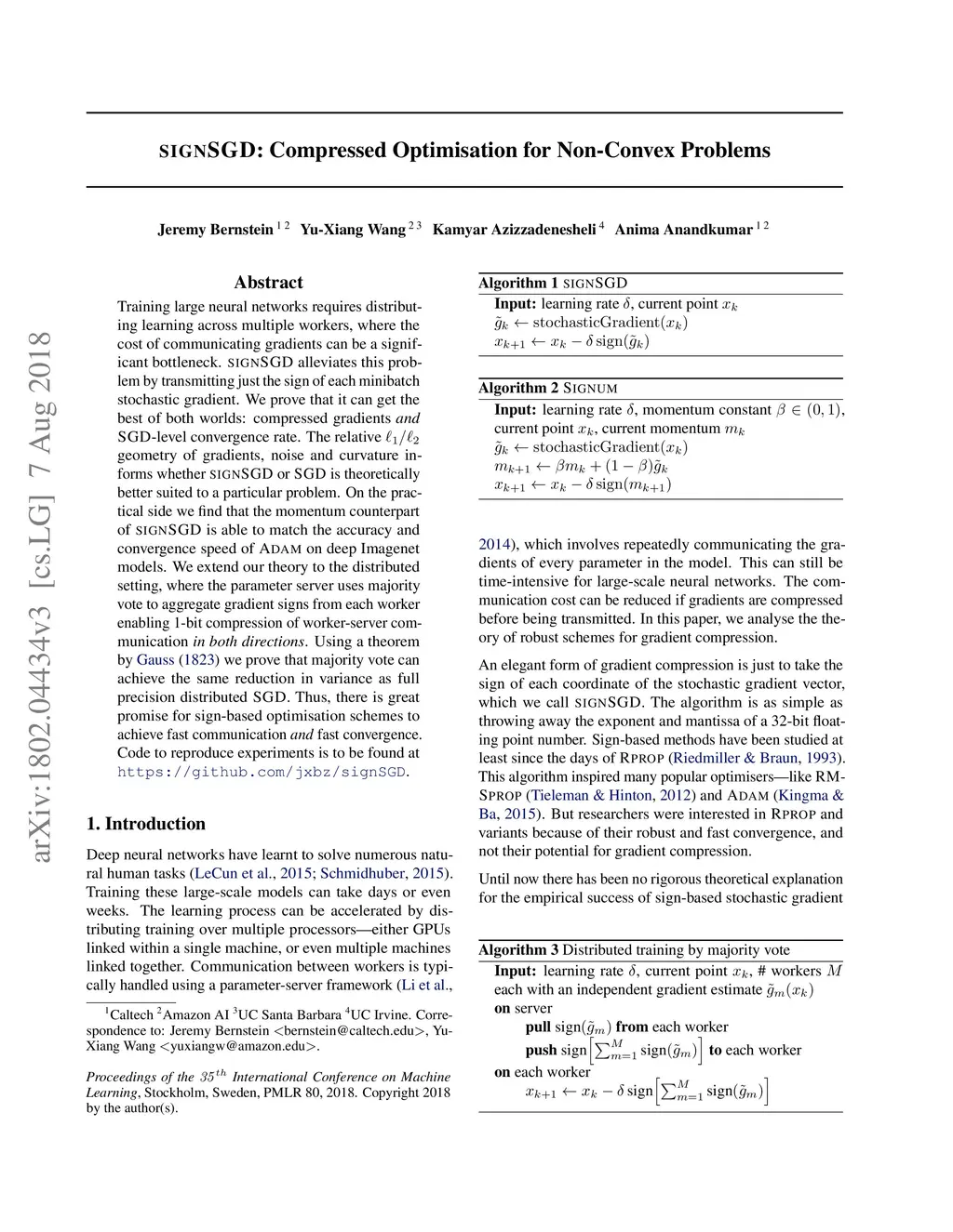 signSGD: Compressed Optimisation for Non-Convex Problems