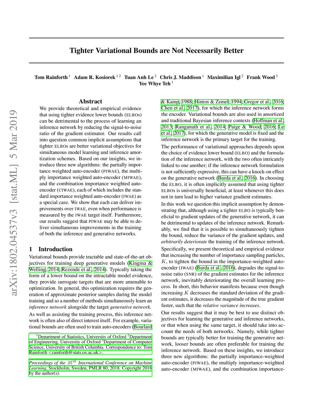 We provide theoretical and empirical evidence that using tighter evidence lower bounds (ELBOs) can be detrimental to the process of learning an inference network by reducing the signal-to-noise ratio of the gradient estimator. Our results call into question common implicit assumptions that tighter ELBOs are better variational objectives for simultaneous model learning and inference amortization schemes. Based on our insights, we introduce three new algorithms: the partially importance weighted auto-encoder (PIWAE), the multiply importance weighted auto-encoder (MIWAE), and the combination importance weighted auto-encoder (CIWAE), each of which includes the standard importance weighted auto-encoder (IWAE) as a special case. We show that each can deliver improvements over IWAE, even when performance is measured by the IWAE target itself. Furthermore, our results suggest that PIWAE may be able to deliver simultaneous improvements in the training of both the inference and generative networks.