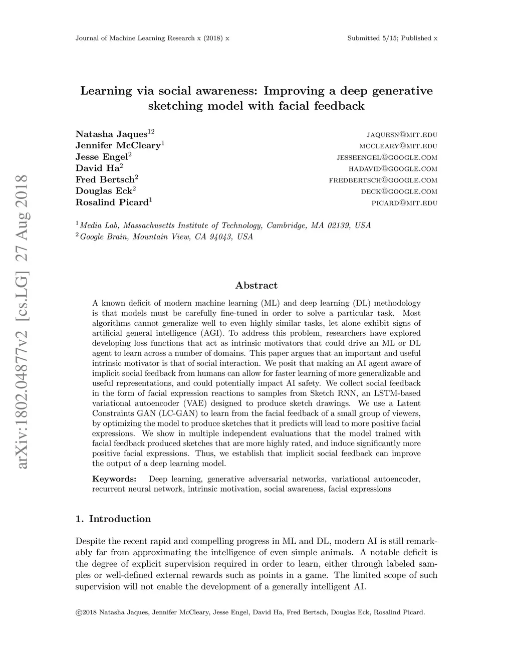 In the quest towards general artificial intelligence (AI), researchers have explored developing loss functions that act as intrinsic motivators in the absence of external rewards. This paper argues that such research has overlooked an important and useful intrinsic motivator: social interaction. We posit that making an AI agent aware of implicit social feedback from humans can allow for faster learning of more generalizable and useful representations, and could potentially impact AI safety. We collect social feedback in the form of facial expression reactions to samples from Sketch RNN, an LSTM-based variational autoencoder (VAE) designed to produce sketch drawings. We use a Latent Constraints GAN (LC-GAN) to learn from the facial feedback of a small group of viewers, by optimizing the model to produce sketches that it predicts will lead to more positive facial expressions. We show in multiple independent evaluations that the model trained with facial feedback produced sketches that are more highly rated, and induce significantly more positive facial expressions. Thus, we establish that implicit social feedback can improve the output of a deep learning model.