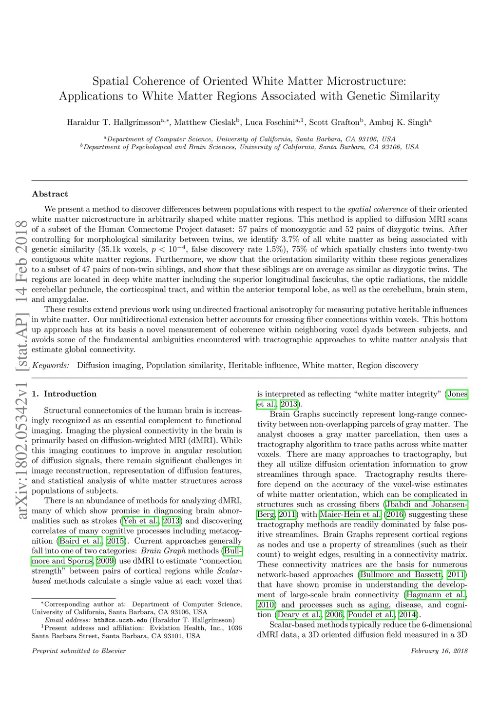 We present a method to discover differences between populations with respect to the spatial coherence of their oriented white matter microstructure in arbitrarily shaped white matter regions. This method is applied to diffusion MRI scans of a subset of the Human Connectome Project dataset: 57 pairs of monozygotic and 52 pairs of dizygotic twins. After controlling for morphological similarity between twins, we identify 3.7% of all white matter as being associated with genetic similarity (35.1k voxels, , false discovery rate 1.5%), 75% of which spatially clusters into twenty-two contiguous white matter regions. Furthermore, we show that the orientation similarity within these regions generalizes to a subset of 47 pairs of non-twin siblings, and show that these siblings are on average as similar as dizygotic twins. The regions are located in deep white matter including the superior longitudinal fasciculus, the optic radiations, the middle cerebellar peduncle, the corticospinal tract, and within the anterior temporal lobe, as well as the cerebellum, brain stem, and amygdalae. These results extend previous work using undirected fractional anisotrophy for measuring putative heritable influences in white matter. Our multidirectional extension better accounts for crossing fiber connections within voxels. This bottom up approach has at its basis a novel measurement of coherence within neighboring voxel dyads between subjects, and avoids some of the fundamental ambiguities encountered with tractographic approaches to white matter analysis that estimate global connectivity.