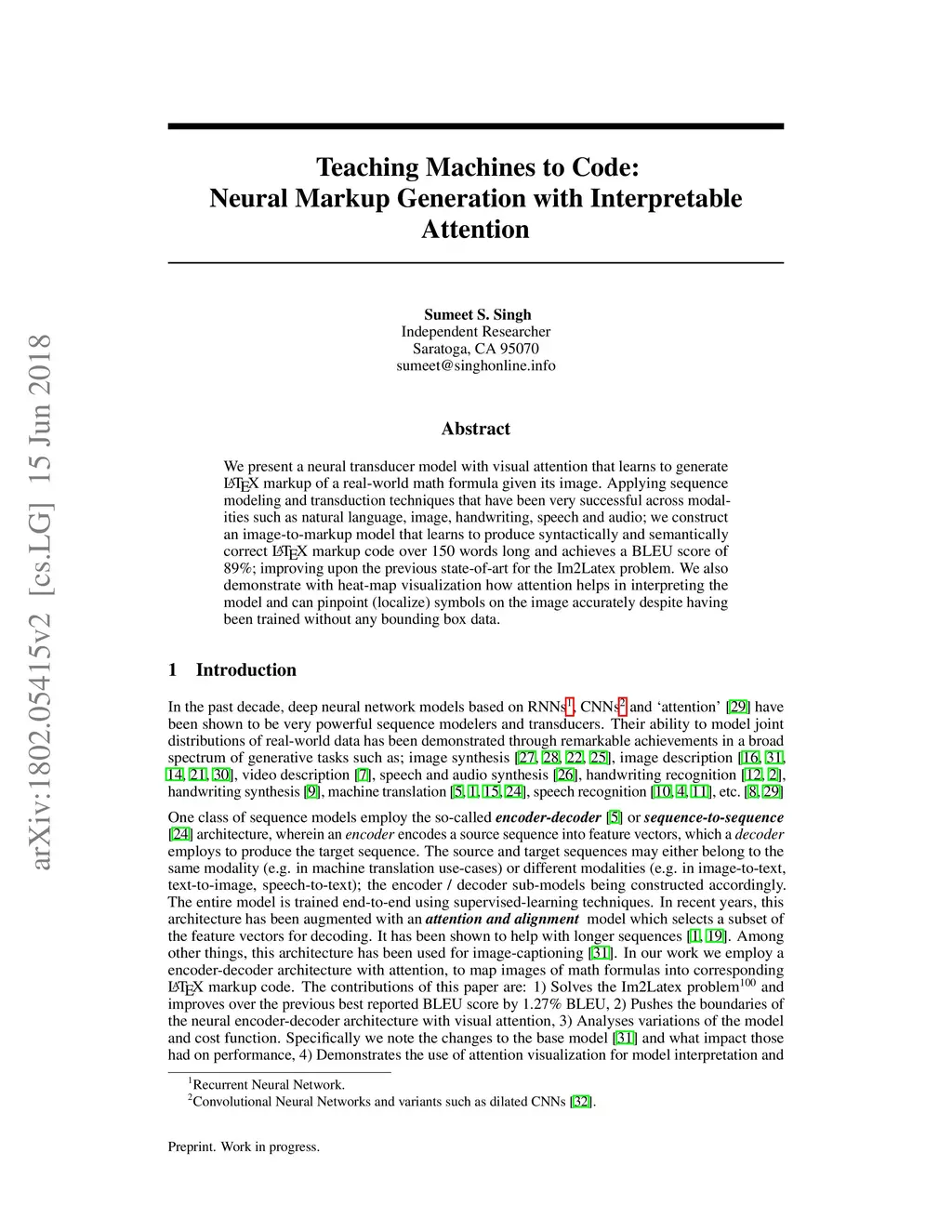 We present a neural transducer model with visual attention that learns to generate LaTeX markup of a real-world math formula given its image. Applying sequence modeling and transduction techniques that have been very successful across modalities such as natural language, image, handwriting, speech and audio; we construct an image-to-markup model that learns to produce syntactically and semantically correct LaTeX markup code over 150 words long and achieves a BLEU score of 89%; improving upon the previous state-of-art for the Im2Latex problem. We also demonstrate with heat-map visualization how attention helps in interpreting the model and can pinpoint (detect and localize) symbols on the image accurately despite having been trained without any bounding box data.