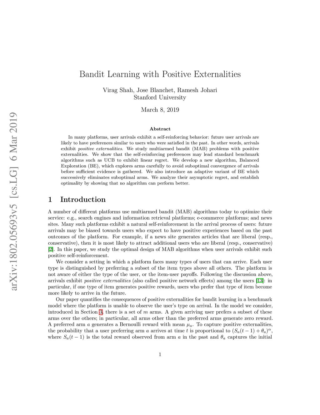 In many platforms, user arrivals exhibit a self-reinforcing behavior: future user arrivals are likely to have preferences similar to users who were satisfied in the past. In other words, arrivals exhibit positive externalities. We study multiarmed bandit (MAB) problems with positive externalities. We show that the self-reinforcing preferences may lead standard benchmark algorithms such as UCB to exhibit linear regret. We develop a new algorithm, Balanced Exploration (BE), which explores arms carefully to avoid suboptimal convergence of arrivals before sufficient evidence is gathered. We also introduce an adaptive variant of BE which successively eliminates suboptimal arms. We analyze their asymptotic regret, and establish optimality by showing that no algorithm can perform better.