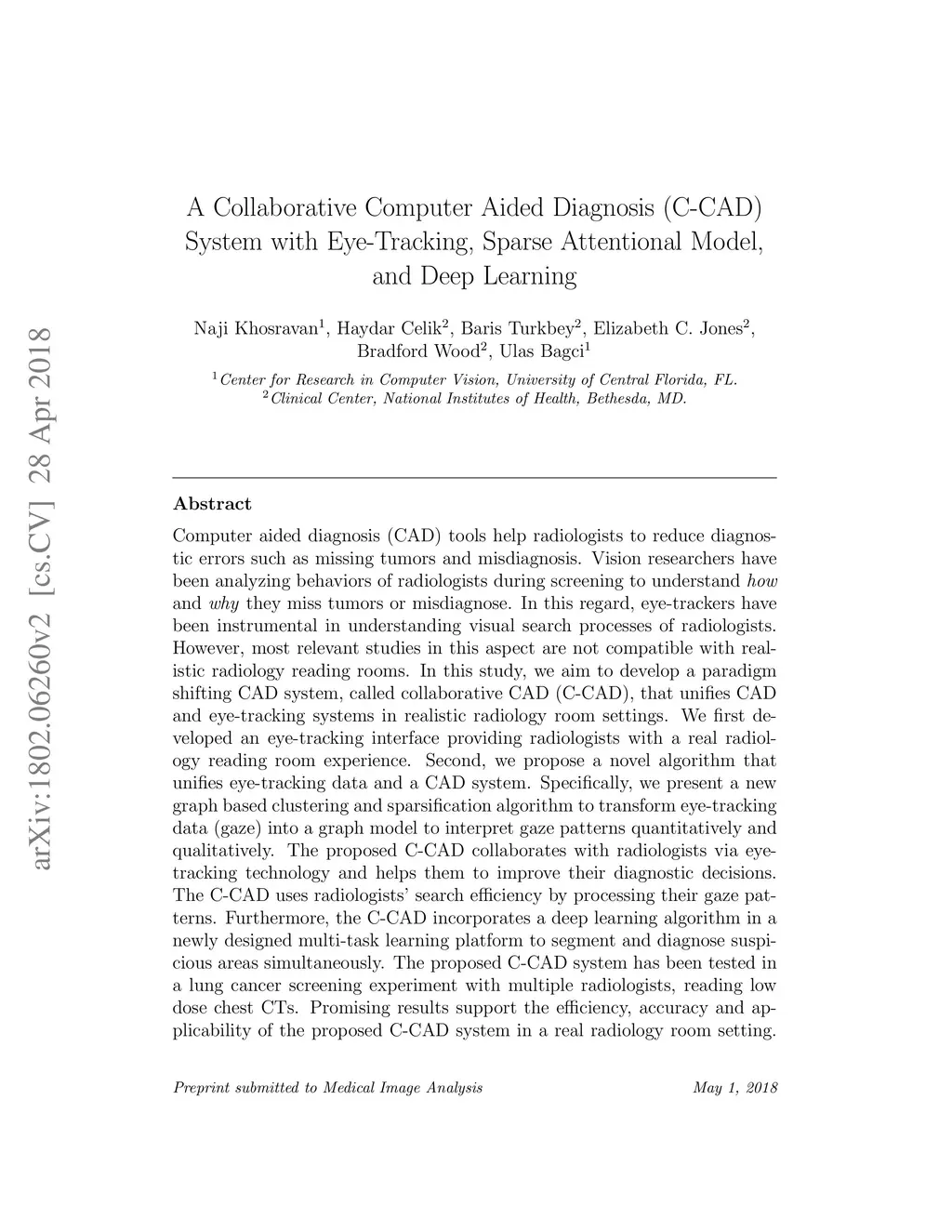 There are at least two categories of errors in radiology screening that can lead to suboptimal diagnostic decisions and interventions:(i)human fallibility and (ii)complexity of visual search. Computer aided diagnostic (CAD) tools are developed to help radiologists to compensate for some of these errors. However, despite their significant improvements over conventional screening strategies, most CAD systems do not go beyond their use as second opinion tools due to producing a high number of false positives, which human interpreters need to correct. In parallel with efforts in computerized analysis of radiology scans, several researchers have examined behaviors of radiologists while screening medical images to better understand how and why they miss tumors, how they interact with the information in an image, and how they search for unknown pathology in the images. Eye-tracking tools have been instrumental in exploring answers to these fundamental questions. In this paper, we aim to develop a paradigm shift CAD system, called collaborative CAD (C-CAD), that unifies both of the above mentioned research lines: CAD and eye-tracking. We design an eye-tracking interface providing radiologists with a real radiology reading room experience. Then, we propose a novel algorithm that unifies eye-tracking data and a CAD system. Specifically, we present a new graph based clustering and sparsification algorithm to transform eye-tracking data (gaze) into a signal model to interpret gaze patterns quantitatively and qualitatively. The proposed C-CAD collaborates with radiologists via eye-tracking technology and helps them to improve diagnostic decisions. The C-CAD learns radiologists' search efficiency by processing their gaze patterns. To do this, the C-CAD uses a deep learning algorithm in a newly designed multi-task learning platform to segment and diagnose cancers simultaneously.