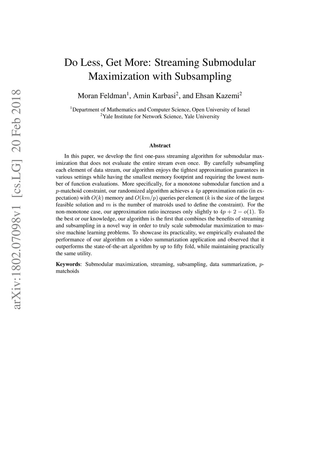 In this paper, we develop the first one-pass streaming algorithm for submodular maximization that does not evaluate the entire stream even once. By carefully subsampling each element of data stream, our algorithm enjoys the tightest approximation guarantees in various settings while having the smallest memory footprint and requiring the lowest number of function evaluations. More specifically, for a monotone submodular function and a -matchoid constraint, our randomized algorithm achieves a approximation ratio (in expectation) with memory and queries per element ( is the size of the largest feasible solution and is the number of matroids used to define the constraint). For the non-monotone case, our approximation ratio increases only slightly to . To the best or our knowledge, our algorithm is the first that combines the benefits of streaming and subsampling in a novel way in order to truly scale submodular maximization to massive machine learning problems. To showcase its practicality, we empirically evaluated the performance of our algorithm on a video summarization application and observed that it outperforms the state-of-the-art algorithm by up to fifty fold, while maintaining practically the same utility.