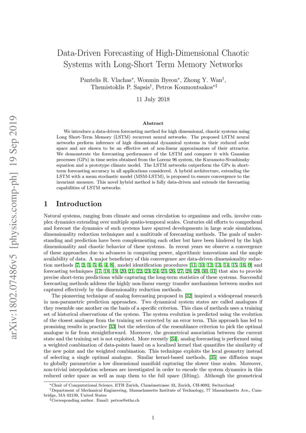 We introduce a data-driven forecasting method for high-dimensional chaotic systems using long short-term memory (LSTM) recurrent neural networks. The proposed LSTM neural networks perform inference of high-dimensional dynamical systems in their reduced order space and are shown to be an effective set of nonlinear approximators of their attractor. We demonstrate the forecasting performance of the LSTM and compare it with Gaussian processes (GPs) in time series obtained from the Lorenz 96 system, the Kuramoto-Sivashinsky equation and a prototype climate model. The LSTM networks outperform the GPs in short-term forecasting accuracy in all applications considered. A hybrid architecture, extending the LSTM with a mean stochastic model (MSM-LSTM), is proposed to ensure convergence to the invariant measure. This novel hybrid method is fully data-driven and extends the forecasting capabilities of LSTM networks.