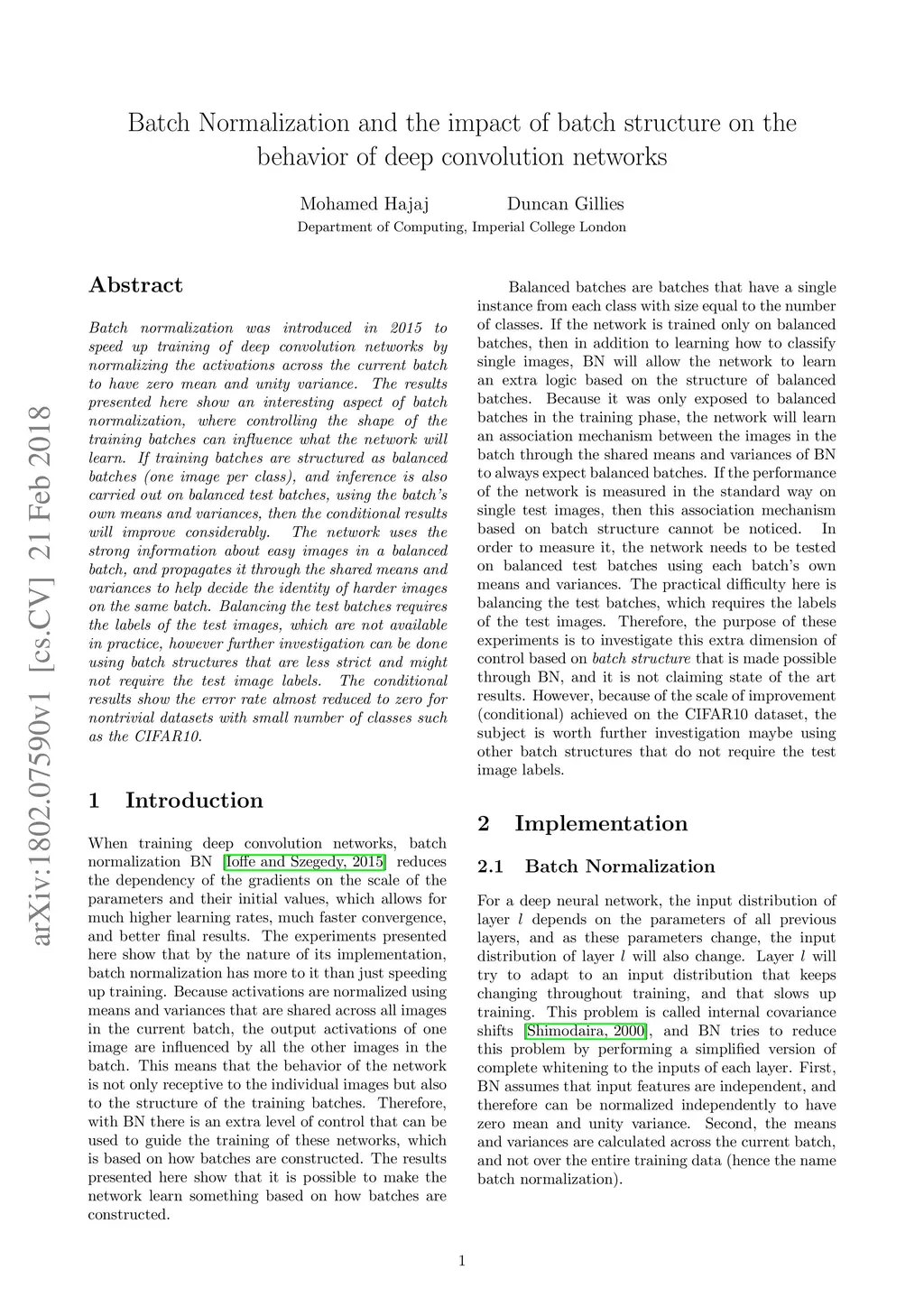 Batch normalization was introduced in 2015 to speed up training of deep convolution networks by normalizing the activations across the current batch to have zero mean and unity variance. The results presented here show an interesting aspect of batch normalization, where controlling the shape of the training batches can influence what the network will learn. If training batches are structured as balanced batches (one image per class), and inference is also carried out on balanced test batches, using the batch's own means and variances, then the conditional results will improve considerably. The network uses the strong information about easy images in a balanced batch, and propagates it through the shared means and variances to help decide the identity of harder images on the same batch. Balancing the test batches requires the labels of the test images, which are not available in practice, however further investigation can be done using batch structures that are less strict and might not require the test image labels. The conditional results show the error rate almost reduced to zero for nontrivial datasets with small number of classes such as the CIFAR10.