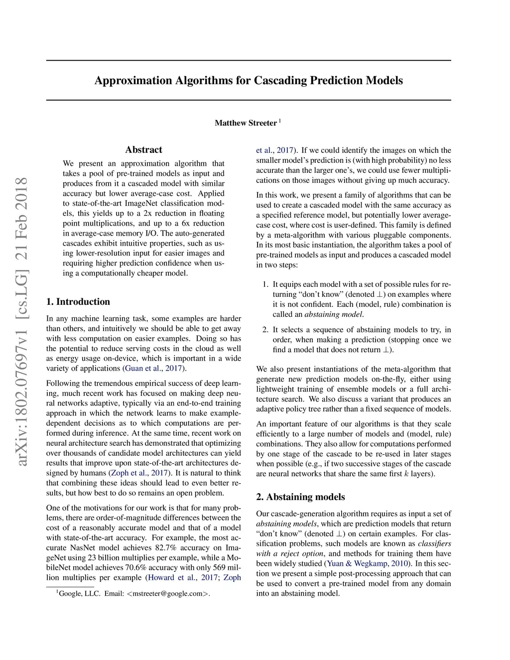 We present an approximation algorithm that takes a pool of pre-trained models as input and produces from it a cascaded model with similar accuracy but lower average-case cost. Applied to state-of-the-art ImageNet classification models, this yields up to a 2x reduction in floating point multiplications, and up to a 6x reduction in average-case memory I/O. The auto-generated cascades exhibit intuitive properties, such as using lower-resolution input for easier images and requiring higher prediction confidence when using a computationally cheaper model.