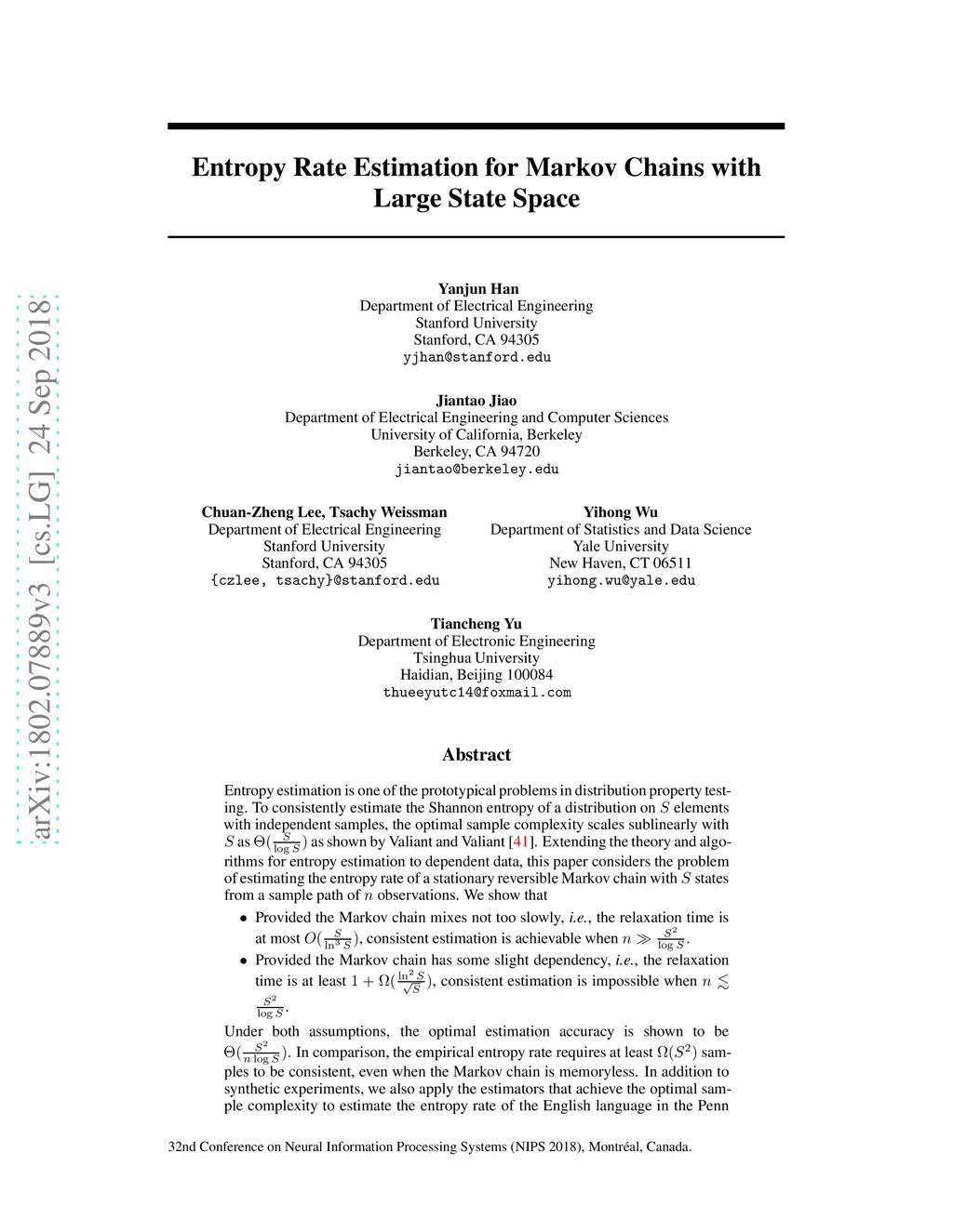 Estimating the entropy based on data is one of the prototypical problems in distribution property testing and estimation. For estimating the Shannon entropy of a distribution on elements with independent samples, [Paninski2004] showed that the sample complexity is sublinear in , and [Valiant--Valiant2011] showed that consistent estimation of Shannon entropy is possible if and only if the sample size far exceeds . In this paper we consider the problem of estimating the entropy rate of a stationary reversible Markov chain with states from a sample path of observations. We show that: (1) As long as the Markov chain mixes not too slowly, i.e., the relaxation time is at most , consistent estimation is achievable when . (2) As long as the Markov chain has some slight dependency, i.e., the relaxation time is at least , consistent estimation is impossible when . Under both assumptions, the optimal estimation accuracy is shown to be . In comparison, the empirical entropy rate requires at least samples to be consistent, even when the Markov chain is memoryless. In addition to synthetic experiments, we also apply the estimators that achieve the optimal sample complexity to estimate the entropy rate of the English language in the Penn Treebank and the Google One Billion Words corpora, which provides a natural benchmark for language modeling and relates it directly to the widely used perplexity measure.