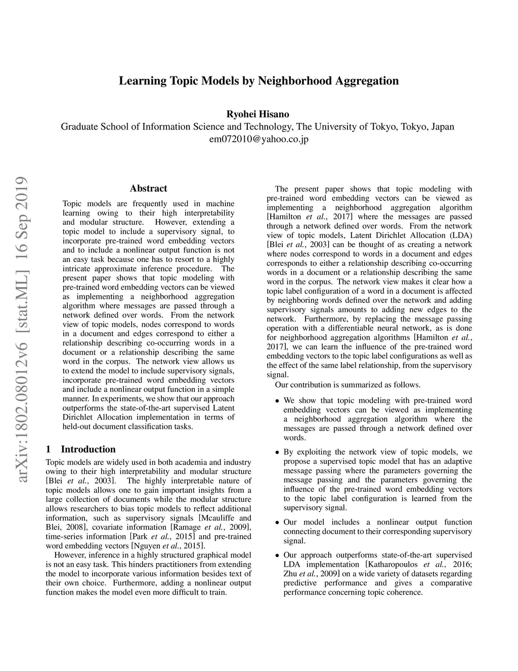Topic models are frequently used in machine learning owing to their high interpretability and modular structure. However, extending a topic model to include a supervisory signal, to incorporate pre-trained word embedding vectors and to include a nonlinear output function is not an easy task because one has to resort to a highly intricate approximate inference procedure. The present paper shows that topic modeling with pre-trained word embedding vectors can be viewed as implementing a neighborhood aggregation algorithm where messages are passed through a network defined over words. From the network view of topic models, nodes correspond to words in a document and edges correspond to either a relationship describing co-occurring words in a document or a relationship describing the same word in the corpus. The network view allows us to extend the model to include supervisory signals, incorporate pre-trained word embedding vectors and include a nonlinear output function in a simple manner. In experiments, we show that our approach outperforms the state-of-the-art supervised Latent Dirichlet Allocation implementation in terms of held-out document classification tasks.