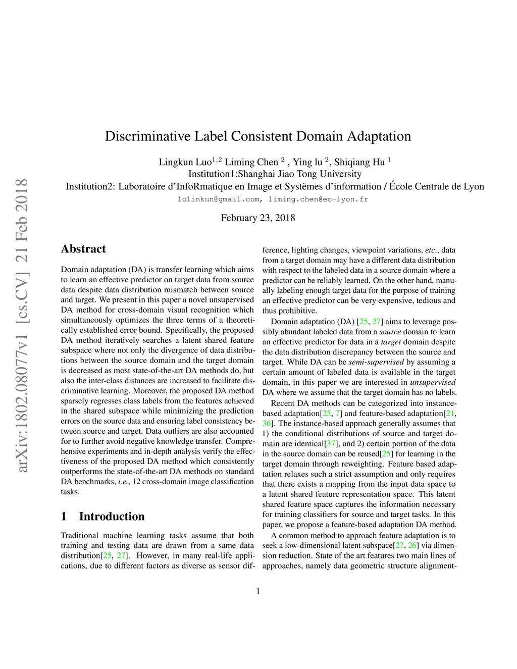 Domain adaptation (DA) is transfer learning which aims to learn an effective predictor on target data from source data despite data distribution mismatch between source and target. We present in this paper a novel unsupervised DA method for cross-domain visual recognition which simultaneously optimizes the three terms of a theoretically established error bound. Specifically, the proposed DA method iteratively searches a latent shared feature subspace where not only the divergence of data distributions between the source domain and the target domain is decreased as most state-of-the-art DA methods do, but also the inter-class distances are increased to facilitate discriminative learning. Moreover, the proposed DA method sparsely regresses class labels from the features achieved in the shared subspace while minimizing the prediction errors on the source data and ensuring label consistency between source and target. Data outliers are also accounted for to further avoid negative knowledge transfer. Comprehensive experiments and in-depth analysis verify the effectiveness of the proposed DA method which consistently outperforms the state-of-the-art DA methods on standard DA benchmarks, i.e., 12 cross-domain image classification tasks.