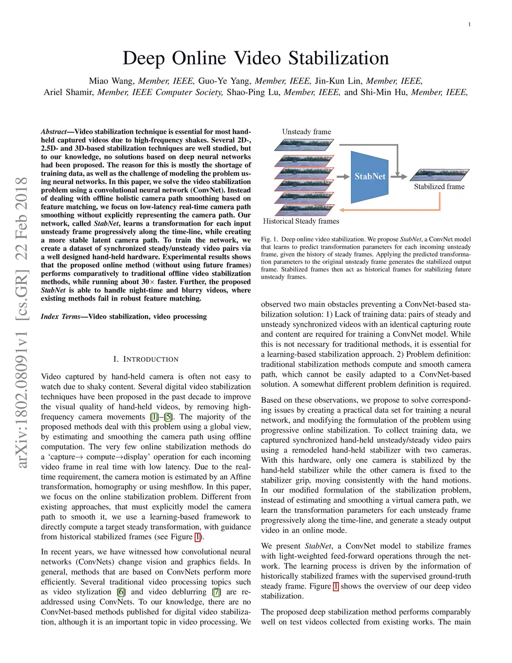 Video stabilization technique is essential for most hand-held captured videos due to high-frequency shakes. Several 2D-, 2.5D- and 3D-based stabilization techniques are well studied, but to our knowledge, no solutions based on deep neural networks had been proposed. The reason for this is mostly the shortage of training data, as well as the challenge of modeling the problem using neural networks. In this paper, we solve the video stabilization problem using a convolutional neural network (ConvNet). Instead of dealing with offline holistic camera path smoothing based on feature matching, we focus on low-latency real-time camera path smoothing without explicitly representing the camera path. Our network, called StabNet, learns a transformation for each input unsteady frame progressively along the time-line, while creating a more stable latent camera path. To train the network, we create a dataset of synchronized steady/unsteady video pairs via a well designed hand-held hardware. Experimental results shows that the proposed online method (without using future frames) performs comparatively to traditional offline video stabilization methods, while running about 30 times faster. Further, the proposed StabNet is able to handle night-time and blurry videos, where existing methods fail in robust feature matching.