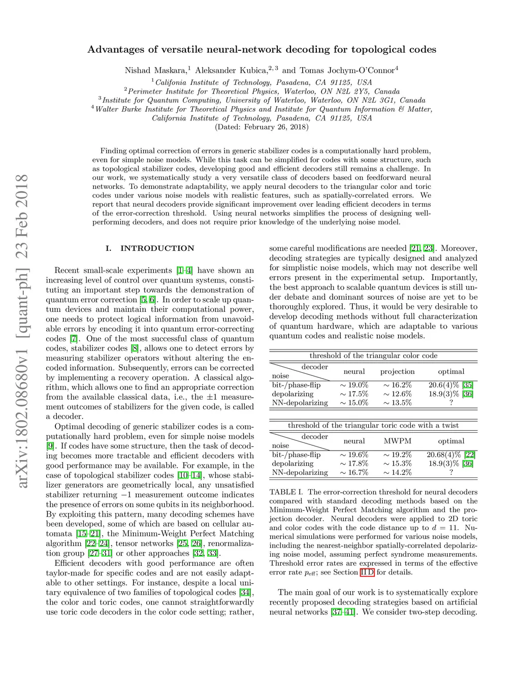 Finding optimal correction of errors in generic stabilizer codes is a computationally hard problem, even for simple noise models. While this task can be simplified for codes with some structure, such as topological stabilizer codes, developing good and efficient decoders still remains a challenge. In our work, we systematically study a very versatile class of decoders based on feedforward neural networks. To demonstrate adaptability, we apply neural decoders to the triangular color and toric codes under various noise models with realistic features, such as spatially-correlated errors. We report that neural decoders provide significant improvement over leading efficient decoders in terms of the error-correction threshold. Using neural networks simplifies the process of designing well-performing decoders, and does not require prior knowledge of the underlying noise model.