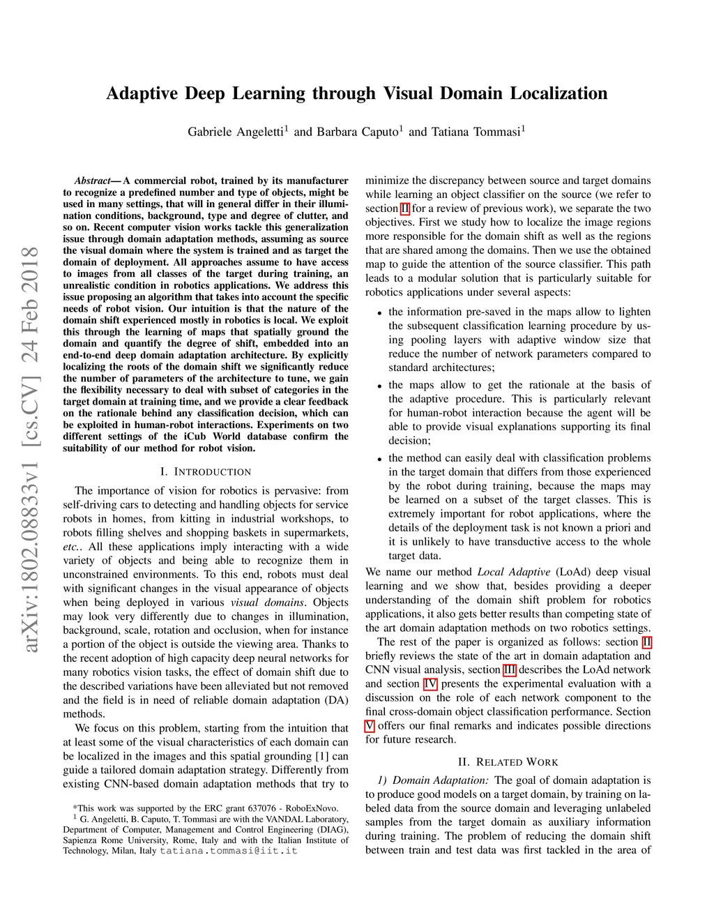 A commercial robot, trained by its manufacturer to recognize a predefined number and type of objects, might be used in many settings, that will in general differ in their illumination conditions, background, type and degree of clutter, and so on. Recent computer vision works tackle this generalization issue through domain adaptation methods, assuming as source the visual domain where the system is trained and as target the domain of deployment. All approaches assume to have access to images from all classes of the target during training, an unrealistic condition in robotics applications. We address this issue proposing an algorithm that takes into account the specific needs of robot vision. Our intuition is that the nature of the domain shift experienced mostly in robotics is local. We exploit this through the learning of maps that spatially ground the domain and quantify the degree of shift, embedded into an end-to-end deep domain adaptation architecture. By explicitly localizing the roots of the domain shift we significantly reduce the number of parameters of the architecture to tune, we gain the flexibility necessary to deal with subset of categories in the target domain at training time, and we provide a clear feedback on the rationale behind any classification decision, which can be exploited in human-robot interactions. Experiments on two different settings of the iCub World database confirm the suitability of our method for robot vision.