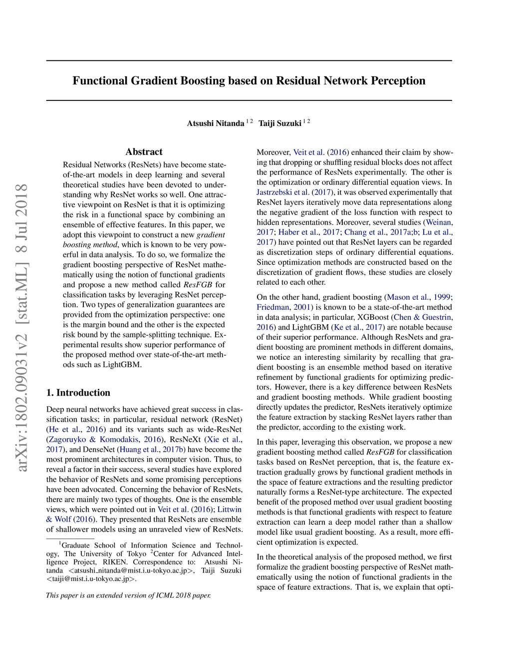 Residual Networks (ResNets) have become state-of-the-art models in deep learning and several theoretical studies have been devoted to understanding why ResNet works so well. One attractive viewpoint on ResNet is that it is optimizing the risk in a functional space by combining an ensemble of effective features. In this paper, we adopt this viewpoint to construct a new gradient boosting method, which is known to be very powerful in data analysis. To do so, we formalize the gradient boosting perspective of ResNet mathematically using the notion of functional gradients and propose a new method called ResFGB for classification tasks by leveraging ResNet perception. Two types of generalization guarantees are provided from the optimization perspective: one is the margin bound and the other is the expected risk bound by the sample-splitting technique. Experimental results show superior performance of the proposed method over state-of-the-art methods such as LightGBM.