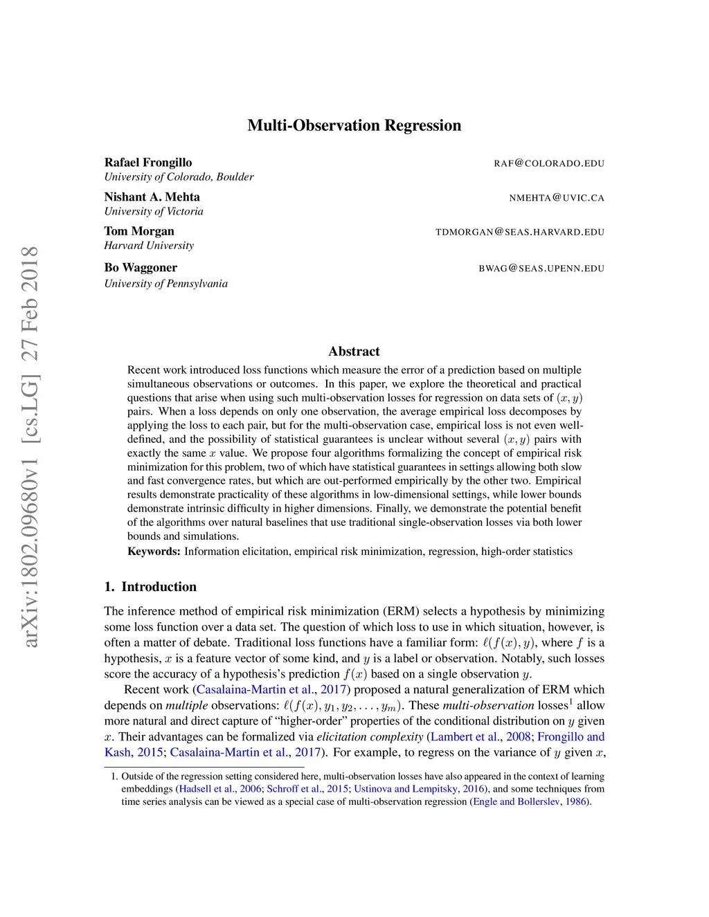 Recent work introduced loss functions which measure the error of a prediction based on multiple simultaneous observations or outcomes. In this paper, we explore the theoretical and practical questions that arise when using such multi-observation losses for regression on data sets of pairs. When a loss depends on only one observation, the average empirical loss decomposes by applying the loss to each pair, but for the multi-observation case, empirical loss is not even well-defined, and the possibility of statistical guarantees is unclear without several pairs with exactly the same value. We propose four algorithms formalizing the concept of empirical risk minimization for this problem, two of which have statistical guarantees in settings allowing both slow and fast convergence rates, but which are out-performed empirically by the other two. Empirical results demonstrate practicality of these algorithms in low-dimensional settings, while lower bounds demonstrate intrinsic difficulty in higher dimensions. Finally, we demonstrate the potential benefit of the algorithms over natural baselines that use traditional single-observation losses via both lower bounds and simulations.