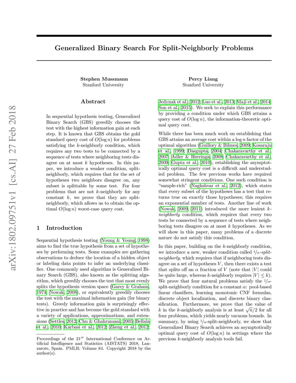 In sequential hypothesis testing, Generalized Binary Search (GBS) greedily chooses the test with the highest information gain at each step. It is known that GBS obtains the gold standard query cost of for problems satisfying the -neighborly condition, which requires any two tests to be connected by a sequence of tests where neighboring tests disagree on at most hypotheses. In this paper, we introduce a weaker condition, split-neighborly, which requires that for the set of hypotheses two neighbors disagree on, any subset is splittable by some test. For four problems that are not -neighborly for any constant , we prove that they are split-neighborly, which allows us to obtain the optimal worst-case query cost.