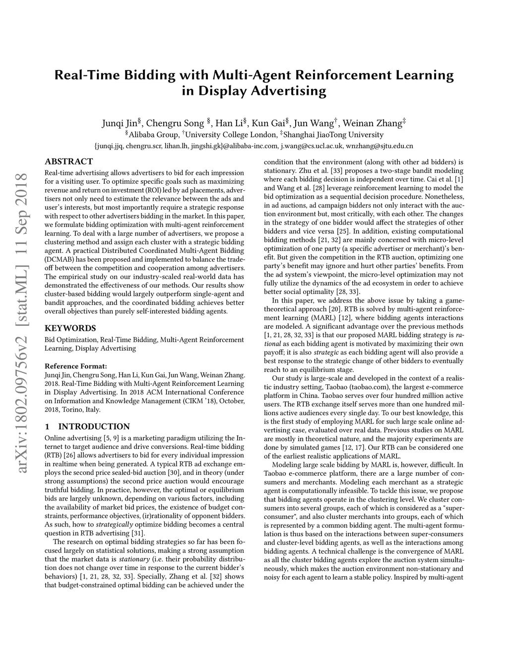 Real-time advertising allows advertisers to bid for each impression for a visiting user. To optimize specific goals such as maximizing revenue and return on investment (ROI) led by ad placements, advertisers not only need to estimate the relevance between the ads and user's interests, but most importantly require a strategic response with respect to other advertisers bidding in the market. In this paper, we formulate bidding optimization with multi-agent reinforcement learning. To deal with a large number of advertisers, we propose a clustering method and assign each cluster with a strategic bidding agent. A practical Distributed Coordinated Multi-Agent Bidding (DCMAB) has been proposed and implemented to balance the tradeoff between the competition and cooperation among advertisers. The empirical study on our industry-scaled real-world data has demonstrated the effectiveness of our methods. Our results show cluster-based bidding would largely outperform single-agent and bandit approaches, and the coordinated bidding achieves better overall objectives than purely self-interested bidding agents.