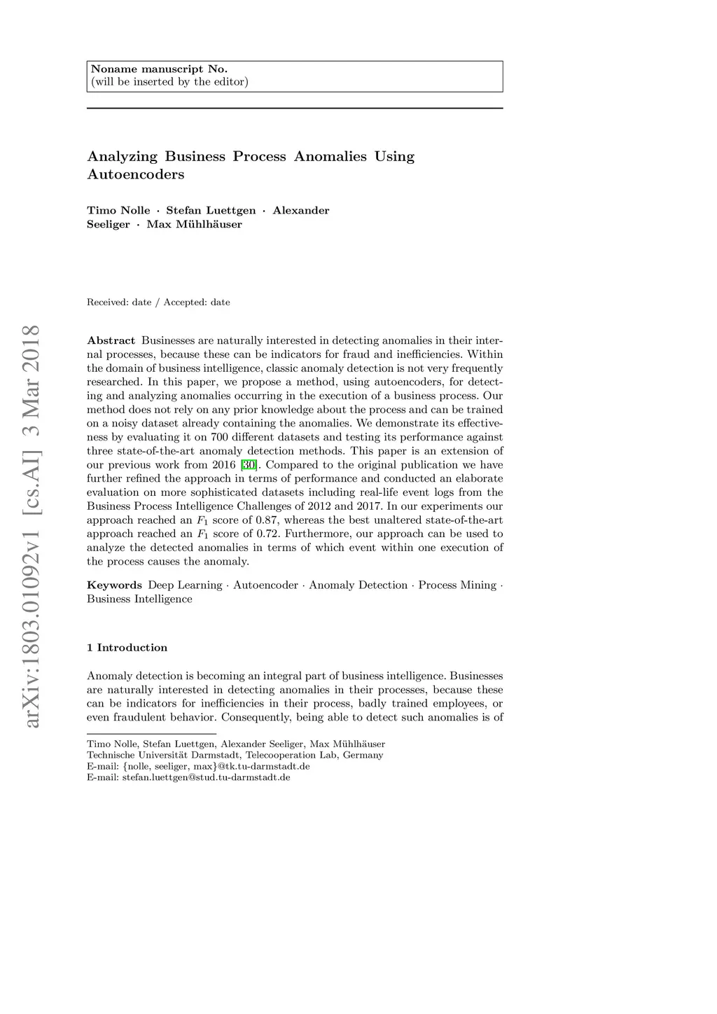 Businesses are naturally interested in detecting anomalies in their internal processes, because these can be indicators for fraud and inefficiencies. Within the domain of business intelligence, classic anomaly detection is not very frequently researched. In this paper, we propose a method, using autoencoders, for detecting and analyzing anomalies occurring in the execution of a business process. Our method does not rely on any prior knowledge about the process and can be trained on a noisy dataset already containing the anomalies. We demonstrate its effectiveness by evaluating it on 700 different datasets and testing its performance against three state-of-the-art anomaly detection methods. This paper is an extension of our previous work from 2016 [30]. Compared to the original publication we have further refined the approach in terms of performance and conducted an elaborate evaluation on more sophisticated datasets including real-life event logs from the Business Process Intelligence Challenges of 2012 and 2017. In our experiments our approach reached an F1 score of 0.87, whereas the best unaltered state-of-the-art approach reached an F1 score of 0.72. Furthermore, our approach can be used to analyze the detected anomalies in terms of which event within one execution of the process causes the anomaly.