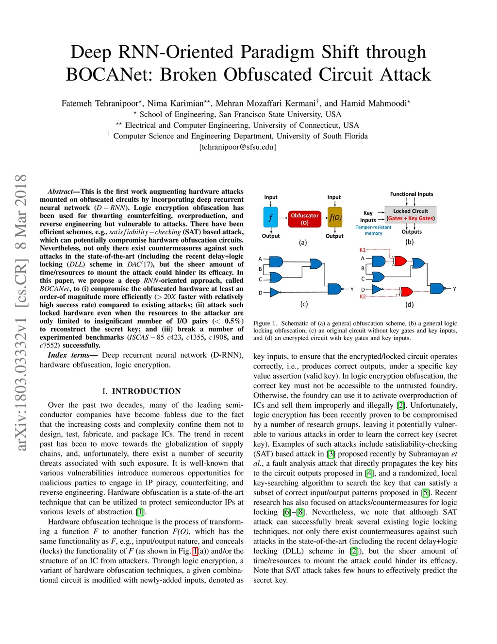 This is the first work augmenting hardware attacks mounted on obfuscated circuits by incorporating deep recurrent neural network (D-RNN). Logic encryption obfuscation has been used for thwarting counterfeiting, overproduction, and reverse engineering but vulnerable to attacks. There have been efficient schemes, e.g., satisfiability-checking (SAT) based attack, which can potentially compromise hardware obfuscation circuits. Nevertheless, not only there exist countermeasures against such attacks in the state-of-the-art (including the recent delay+logic locking (DLL) scheme in DAC'17), but the sheer amount of time/resources to mount the attack could hinder its efficacy. In this paper, we propose a deep RNN-oriented approach, called BOCANet, to (i) compromise the obfuscated hardware at least an order-of magnitude more efficiently (>20X faster with relatively high success rate) compared to existing attacks; (ii) attack such locked hardware even when the resources to the attacker are only limited to insignificant number of I/O pairs (< 0.5\%) to reconstruct the secret key; and (iii) break a number of experimented benchmarks (ISCAS-85 c423, c1355, c1908, and c7552) successfully.