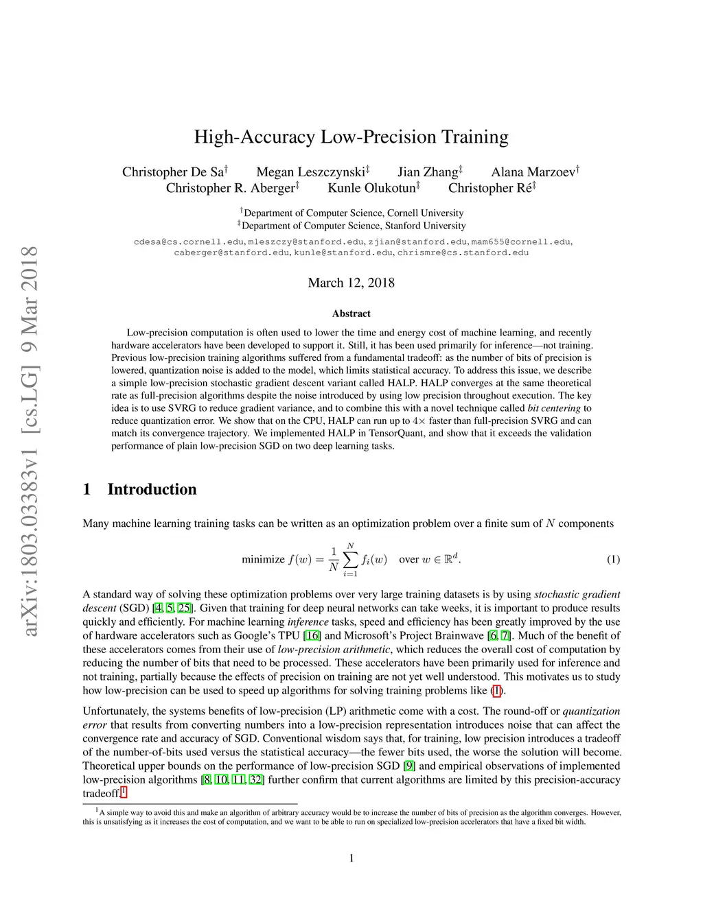 Low-precision computation is often used to lower the time and energy cost of machine learning, and recently hardware accelerators have been developed to support it. Still, it has been used primarily for inference - not training. Previous low-precision training algorithms suffered from a fundamental tradeoff: as the number of bits of precision is lowered, quantization noise is added to the model, which limits statistical accuracy. To address this issue, we describe a simple low-precision stochastic gradient descent variant called HALP. HALP converges at the same theoretical rate as full-precision algorithms despite the noise introduced by using low precision throughout execution. The key idea is to use SVRG to reduce gradient variance, and to combine this with a novel technique called bit centering to reduce quantization error. We show that on the CPU, HALP can run up to faster than full-precision SVRG and can match its convergence trajectory. We implemented HALP in TensorQuant, and show that it exceeds the validation performance of plain low-precision SGD on two deep learning tasks.