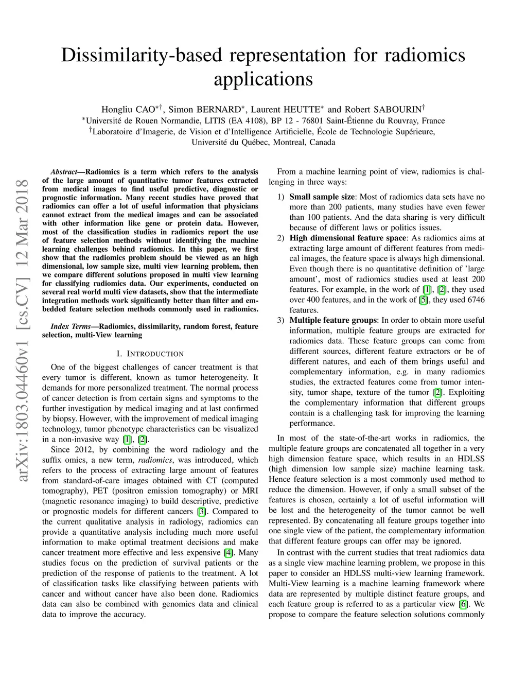 Dissimilarity-based representation for radiomics applications
