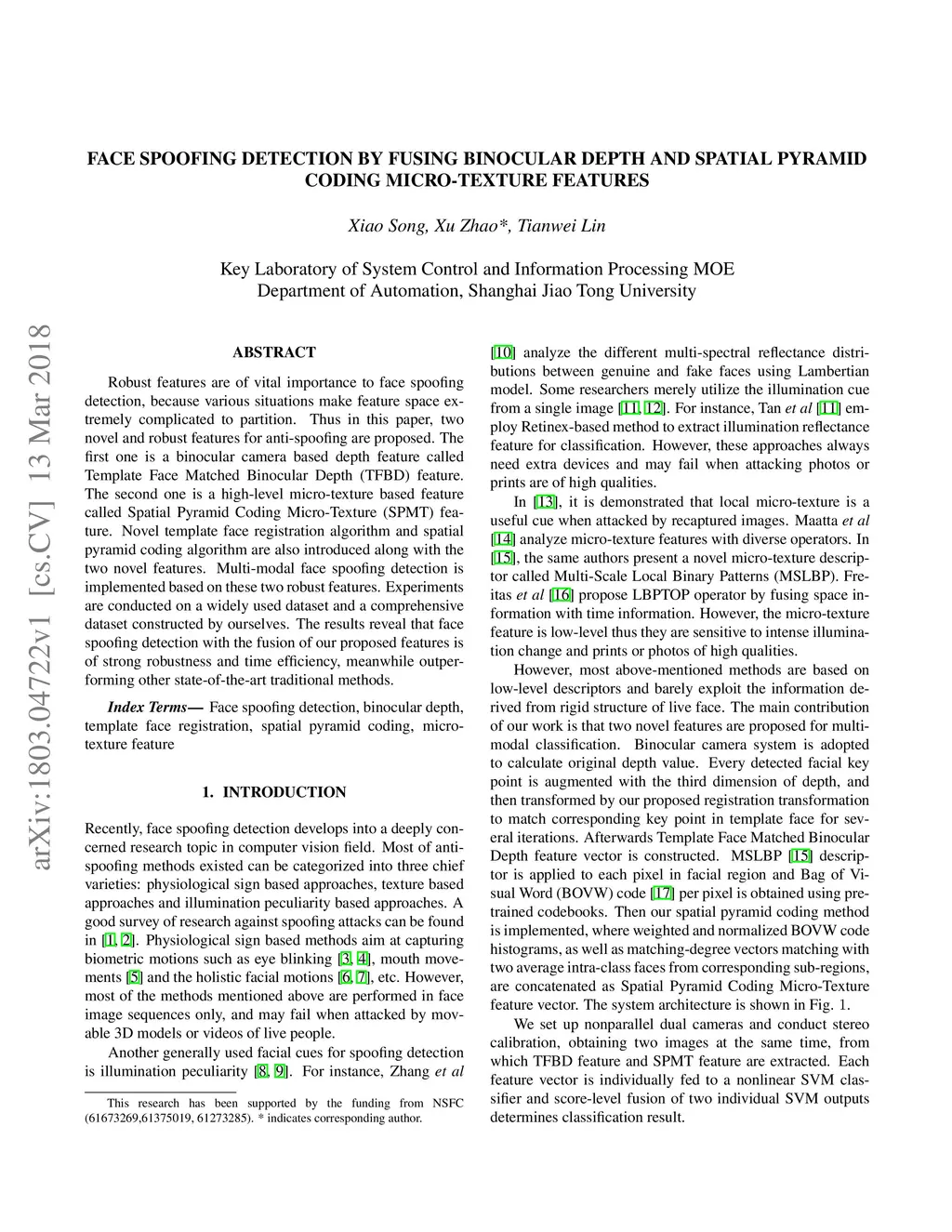Robust features are of vital importance to face spoofing detection, because various situations make feature space extremely complicated to partition. Thus in this paper, two novel and robust features for anti-spoofing are proposed. The first one is a binocular camera based depth feature called Template Face Matched Binocular Depth (TFBD) feature. The second one is a high-level micro-texture based feature called Spatial Pyramid Coding Micro-Texture (SPMT) feature. Novel template face registration algorithm and spatial pyramid coding algorithm are also introduced along with the two novel features. Multi-modal face spoofing detection is implemented based on these two robust features. Experiments are conducted on a widely used dataset and a comprehensive dataset constructed by ourselves. The results reveal that face spoofing detection with the fusion of our proposed features is of strong robustness and time efficiency, meanwhile outperforming other state-of-the-art traditional methods.