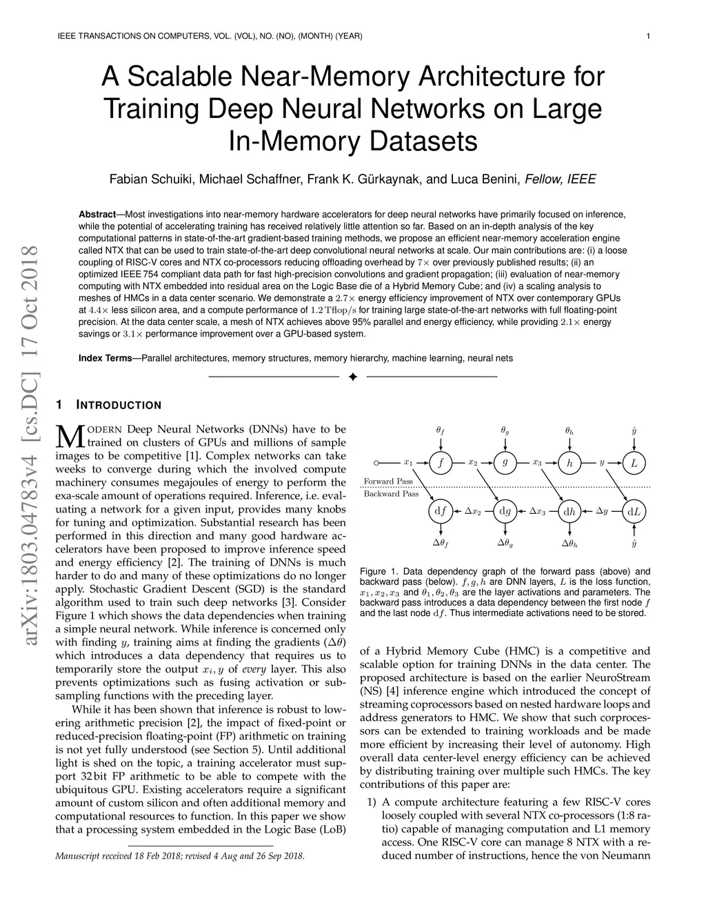 Most investigations into near-memory hardware accelerators for deep neural networks have primarily focused on inference, while the potential of accelerating training has received relatively little attention so far. Based on an in-depth analysis of the key computational patterns in state-of-the-art gradient-based training methods, we propose an efficient near-memory acceleration engine called NTX that can be used to train state-of-the-art deep convolutional neural networks at scale. Our main contributions are: (i) a loose coupling of RISC-V cores and NTX co-processors reducing offloading overhead by 7x over previously published results; (ii) an optimized IEEE754 compliant data path for fast high-precision convolutions and gradient propagation; (iii) evaluation of near-memory computing with NTX embedded into residual area on the Logic Base die of a Hybrid Memory Cube; and (iv) a scaling analysis to meshes of HMCs in a data center scenario. We demonstrate a 2.7x energy efficiency improvement of NTX over contemporary GPUs at 4.4x less silicon area, and a compute performance of 1.2 Tflop/s for training large state-of-the-art networks with full floating-point precision. At the data center scale, a mesh of NTX achieves above 95% parallel and energy efficiency, while providing 2.1x energy savings or 3.1x performance improvement over a GPU-based system.