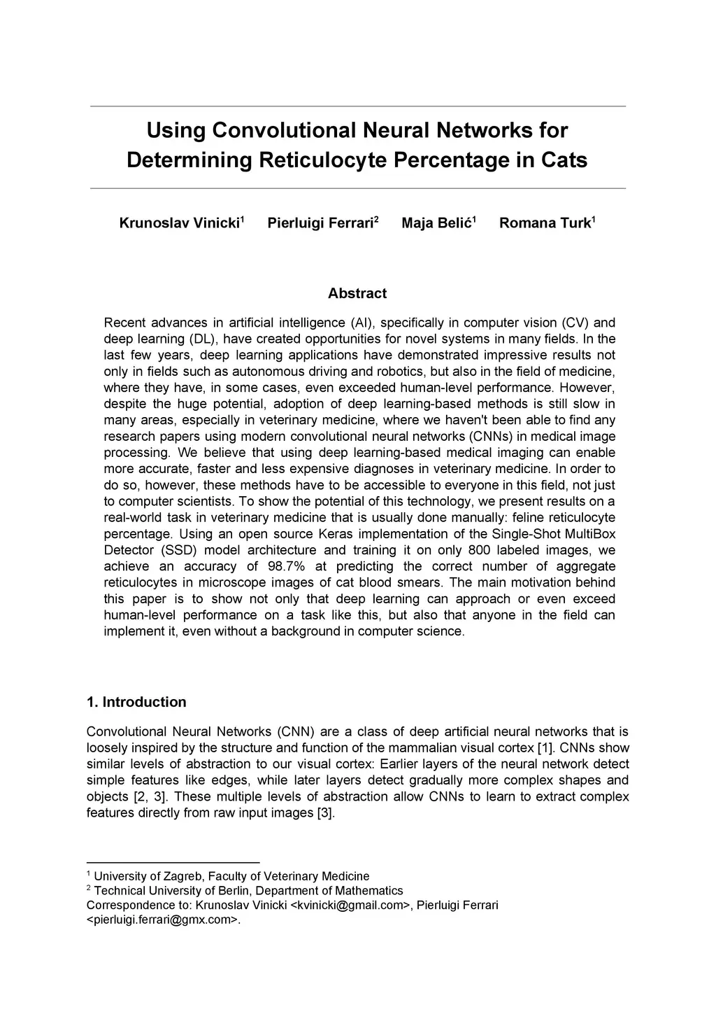 Recent advances in artificial intelligence (AI), specifically in computer vision (CV) and deep learning (DL), have created opportunities for novel systems in many fields. In the last few years, deep learning applications have demonstrated impressive results not only in fields such as autonomous driving and robotics, but also in the field of medicine, where they have, in some cases, even exceeded human-level performance. However, despite the huge potential, adoption of deep learning-based methods is still slow in many areas, especially in veterinary medicine, where we haven't been able to find any research papers using modern convolutional neural networks (CNNs) in medical image processing. We believe that using deep learning-based medical imaging can enable more accurate, faster and less expensive diagnoses in veterinary medicine. In order to do so, however, these methods have to be accessible to everyone in this field, not just to computer scientists. To show the potential of this technology, we present results on a real-world task in veterinary medicine that is usually done manually: feline reticulocyte percentage. Using an open source Keras implementation of the Single-Shot MultiBox Detector (SSD) model architecture and training it on only 800 labeled images, we achieve an accuracy of 98.7% at predicting the correct number of aggregate reticulocytes in microscope images of cat blood smears. The main motivation behind this paper is to show not only that deep learning can approach or even exceed human-level performance on a task like this, but also that anyone in the field can implement it, even without a background in computer science.