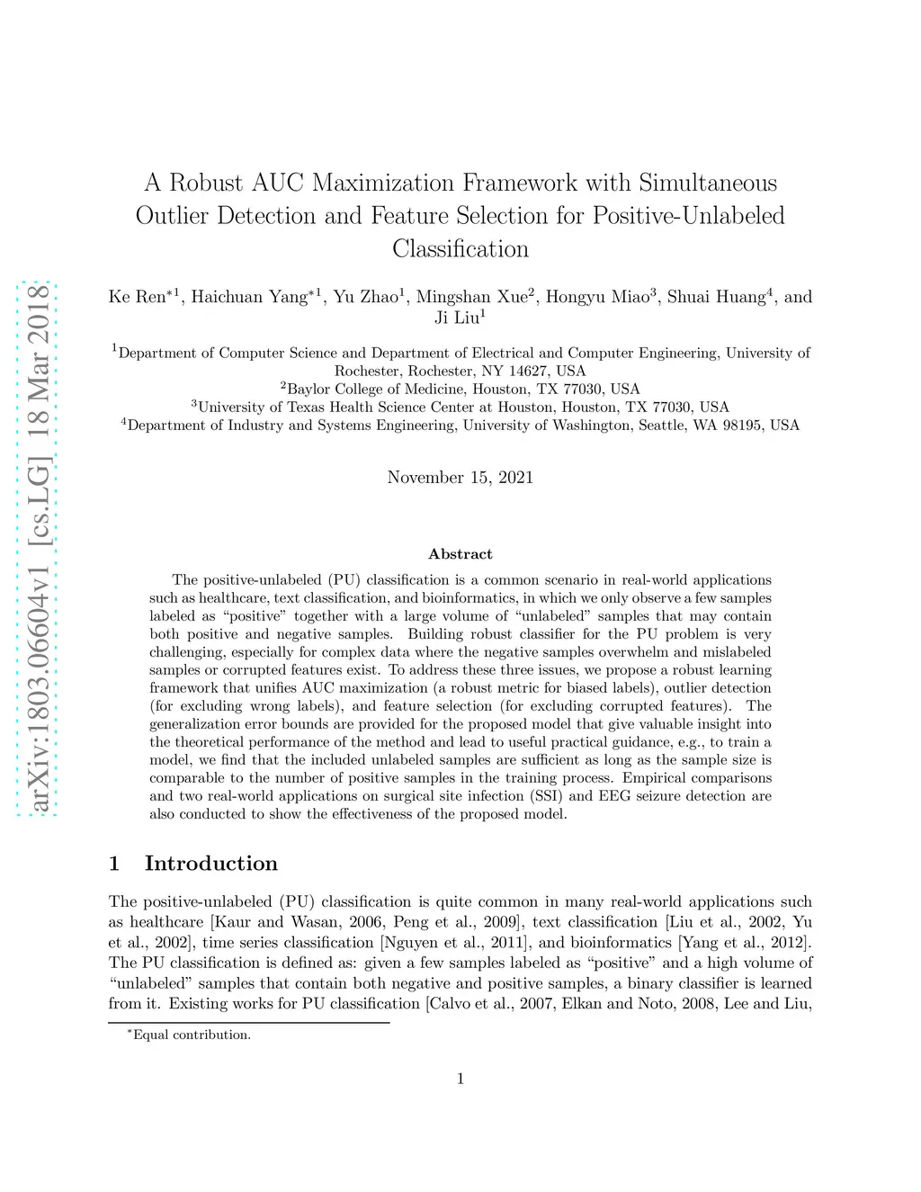 The positive-unlabeled (PU) classification is a common scenario in real-world applications such as healthcare, text classification, and bioinformatics, in which we only observe a few samples labeled as "positive" together with a large volume of "unlabeled" samples that may contain both positive and negative samples. Building robust classifier for the PU problem is very challenging, especially for complex data where the negative samples overwhelm and mislabeled samples or corrupted features exist. To address these three issues, we propose a robust learning framework that unifies AUC maximization (a robust metric for biased labels), outlier detection (for excluding wrong labels), and feature selection (for excluding corrupted features). The generalization error bounds are provided for the proposed model that give valuable insight into the theoretical performance of the method and lead to useful practical guidance, e.g., to train a model, we find that the included unlabeled samples are sufficient as long as the sample size is comparable to the number of positive samples in the training process. Empirical comparisons and two real-world applications on surgical site infection (SSI) and EEG seizure detection are also conducted to show the effectiveness of the proposed model.