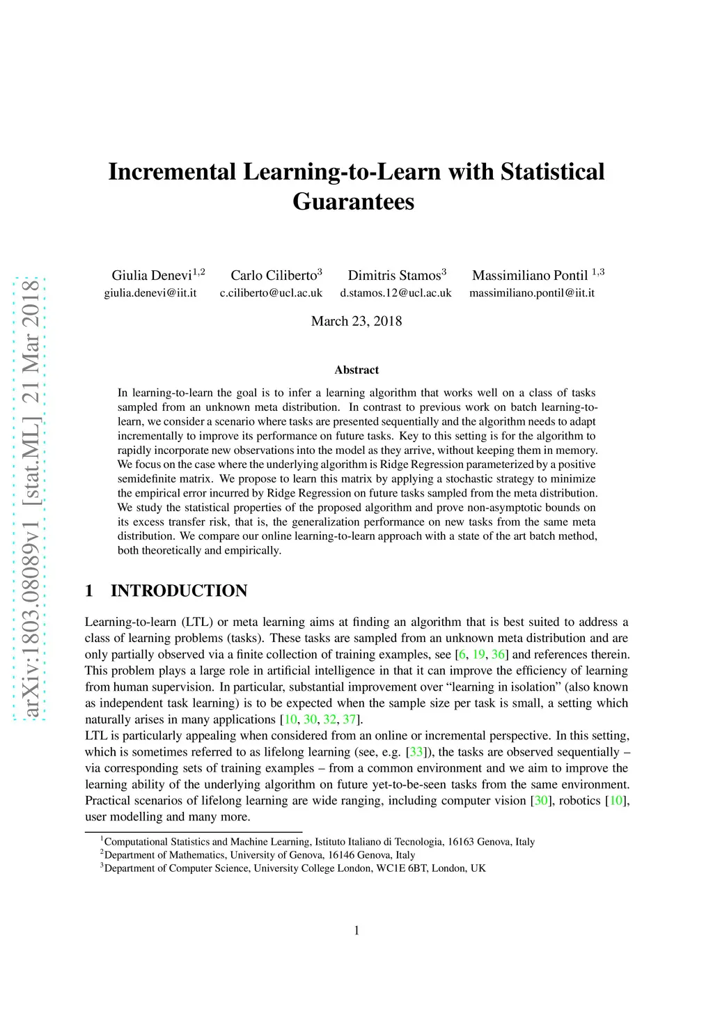 In learning-to-learn the goal is to infer a learning algorithm that works well on a class of tasks sampled from an unknown meta distribution. In contrast to previous work on batch learning-to-learn, we consider a scenario where tasks are presented sequentially and the algorithm needs to adapt incrementally to improve its performance on future tasks. Key to this setting is for the algorithm to rapidly incorporate new observations into the model as they arrive, without keeping them in memory. We focus on the case where the underlying algorithm is ridge regression parameterized by a positive semidefinite matrix. We propose to learn this matrix by applying a stochastic strategy to minimize the empirical error incurred by ridge regression on future tasks sampled from the meta distribution. We study the statistical properties of the proposed algorithm and prove non-asymptotic bounds on its excess transfer risk, that is, the generalization performance on new tasks from the same meta distribution. We compare our online learning-to-learn approach with a state of the art batch method, both theoretically and empirically.