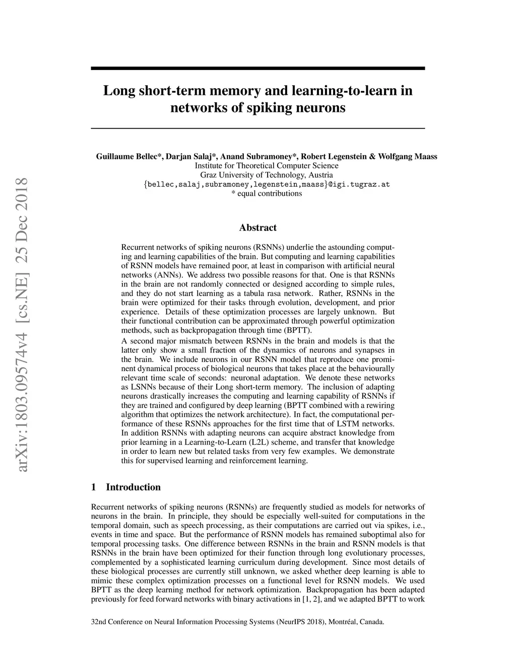 Recurrent networks of spiking neurons (RSNNs) underlie the astounding computing and learning capabilities of the brain. But computing and learning capabilities of RSNN models have remained poor, at least in comparison with artificial neural networks (ANNs). We address two possible reasons for that. One is that RSNNs in the brain are not randomly connected or designed according to simple rules, and they do not start learning as a tabula rasa network. Rather, RSNNs in the brain were optimized for their tasks through evolution, development, and prior experience. Details of these optimization processes are largely unknown. But their functional contribution can be approximated through powerful optimization methods, such as backpropagation through time (BPTT). A second major mismatch between RSNNs in the brain and models is that the latter only show a small fraction of the dynamics of neurons and synapses in the brain. We include neurons in our RSNN model that reproduce one prominent dynamical process of biological neurons that takes place at the behaviourally relevant time scale of seconds: neuronal adaptation. We denote these networks as LSNNs because of their Long short-term memory. The inclusion of adapting neurons drastically increases the computing and learning capability of RSNNs if they are trained and configured by deep learning (BPTT combined with a rewiring algorithm that optimizes the network architecture). In fact, the computational performance of these RSNNs approaches for the first time that of LSTM networks. In addition RSNNs with adapting neurons can acquire abstract knowledge from prior learning in a Learning-to-Learn (L2L) scheme, and transfer that knowledge in order to learn new but related tasks from very few examples. We demonstrate this for supervised learning and reinforcement learning.