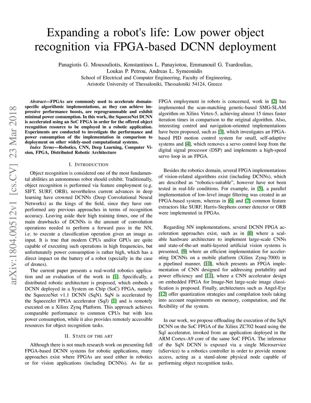 FPGAs are commonly used to accelerate domain-specific algorithmic implementations, as they can achieve impressive performance boosts, are reprogrammable and exhibit minimal power consumption. In this work, the SqueezeNet DCNN is accelerated using an SoC FPGA in order for the offered object recognition resource to be employed in a robotic application. Experiments are conducted to investigate the performance and power consumption of the implementation in comparison to deployment on other widely-used computational systems.