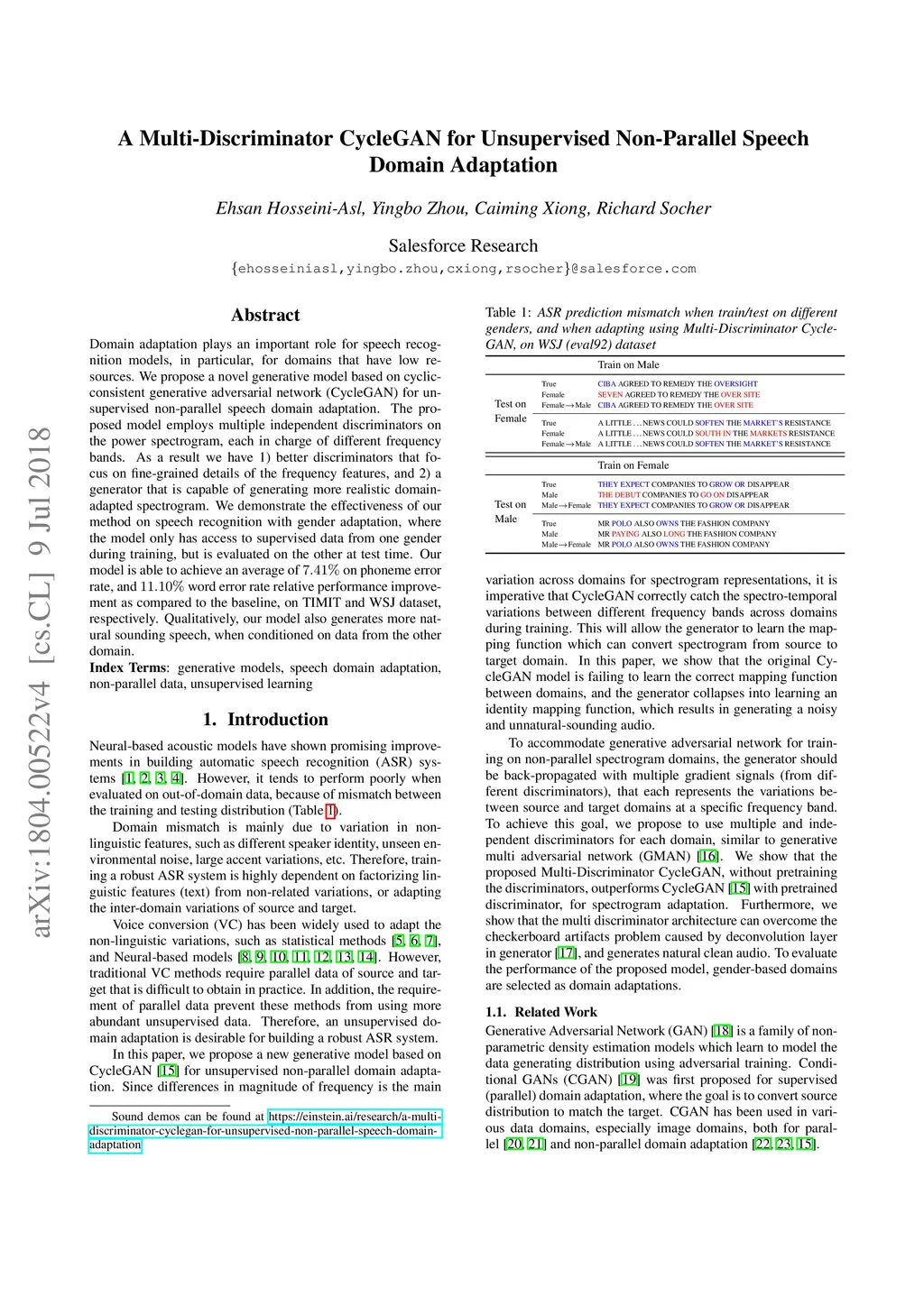 Domain adaptation plays an important role for speech recognition models, in particular, for domains that have low resources. We propose a novel generative model based on cyclic-consistent generative adversarial network (CycleGAN) for unsupervised non-parallel speech domain adaptation. The proposed model employs multiple independent discriminators on the power spectrogram, each in charge of different frequency bands. As a result we have 1) better discriminators that focus on fine-grained details of the frequency features, and 2) a generator that is capable of generating more realistic domain-adapted spectrogram. We demonstrate the effectiveness of our method on speech recognition with gender adaptation, where the model only has access to supervised data from one gender during training, but is evaluated on the other at test time. Our model is able to achieve an average of on phoneme error rate, and word error rate relative performance improvement as compared to the baseline, on TIMIT and WSJ dataset, respectively. Qualitatively, our model also generates more natural sounding speech, when conditioned on data from the other domain.