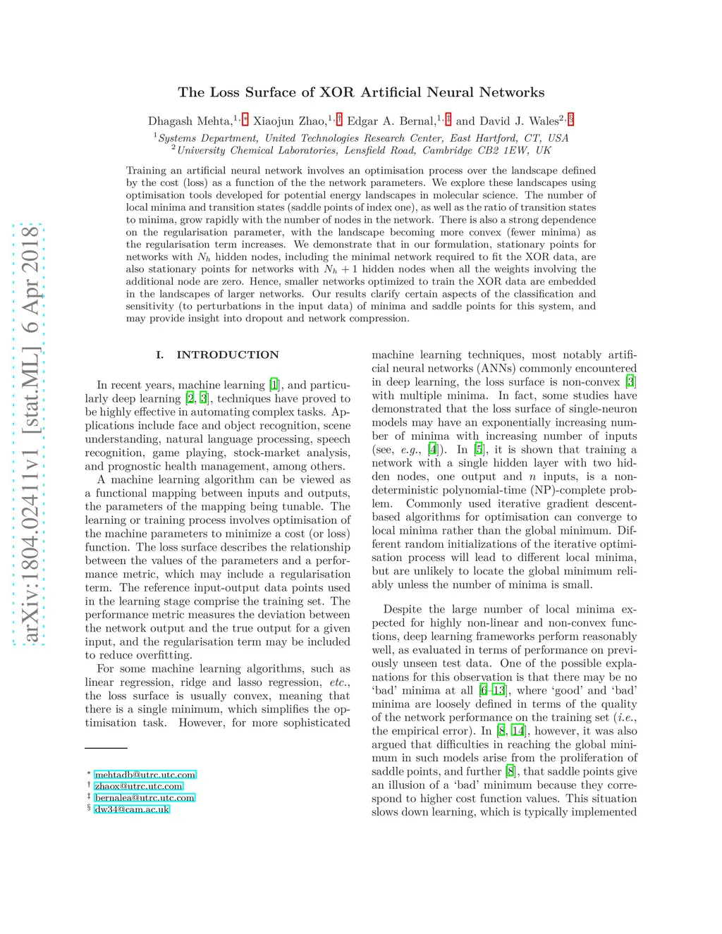 Training an artificial neural network involves an optimization process over the landscape defined by the cost (loss) as a function of the network parameters. We explore these landscapes using optimisation tools developed for potential energy landscapes in molecular science. The number of local minima and transition states (saddle points of index one), as well as the ratio of transition states to minima, grow rapidly with the number of nodes in the network. There is also a strong dependence on the regularisation parameter, with the landscape becoming more convex (fewer minima) as the regularisation term increases. We demonstrate that in our formulation, stationary points for networks with hidden nodes, including the minimal network required to fit the XOR data, are also stationary points for networks with hidden nodes when all the weights involving the additional nodes are zero. Hence, smaller networks optimized to train the XOR data are embedded in the landscapes of larger networks. Our results clarify certain aspects of the classification and sensitivity (to perturbations in the input data) of minima and saddle points for this system, and may provide insight into dropout and network compression.