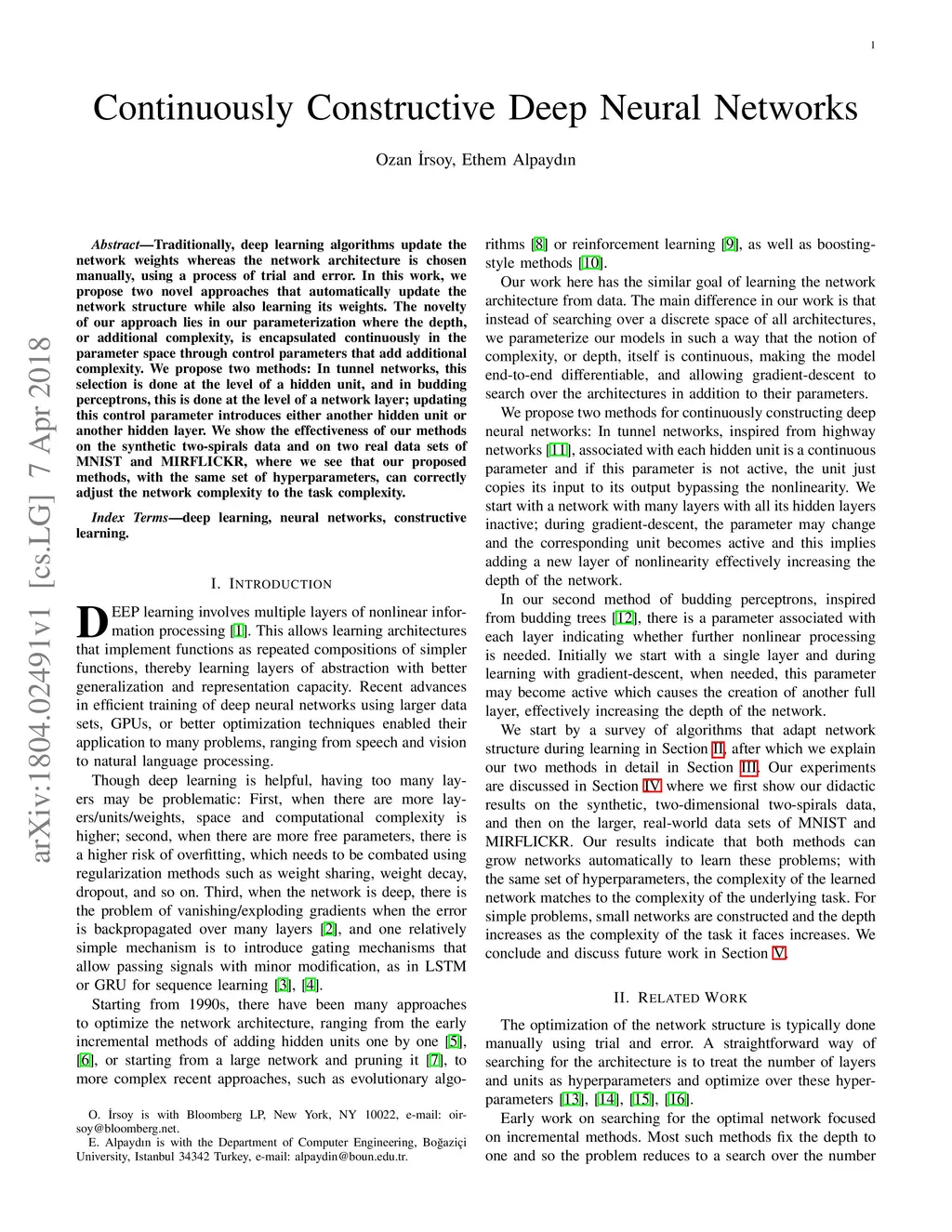Traditionally, deep learning algorithms update the network weights whereas the network architecture is chosen manually, using a process of trial and error. In this work, we propose two novel approaches that automatically update the network structure while also learning its weights. The novelty of our approach lies in our parameterization where the depth, or additional complexity, is encapsulated continuously in the parameter space through control parameters that add additional complexity. We propose two methods: In tunnel networks, this selection is done at the level of a hidden unit, and in budding perceptrons, this is done at the level of a network layer; updating this control parameter introduces either another hidden unit or another hidden layer. We show the effectiveness of our methods on the synthetic two-spirals data and on two real data sets of MNIST and MIRFLICKR, where we see that our proposed methods, with the same set of hyperparameters, can correctly adjust the network complexity to the task complexity.