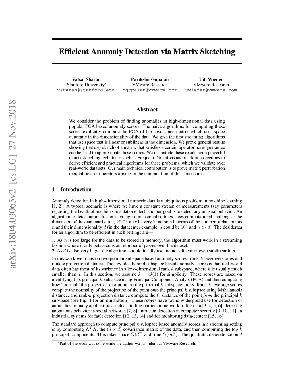 We consider the problem of finding anomalies in high-dimensional data using popular PCA based anomaly scores. The naive algorithms for computing these scores explicitly compute the PCA of the covariance matrix which uses space quadratic in the dimensionality of the data. We give the first streaming algorithms that use space that is linear or sublinear in the dimension. We prove general results showing that \emph{any} sketch of a matrix that satisfies a certain operator norm guarantee can be used to approximate these scores. We instantiate these results with powerful matrix sketching techniques such as Frequent Directions and random projections to derive efficient and practical algorithms for these problems, which we validate over real-world data sets. Our main technical contribution is to prove matrix perturbation inequalities for operators arising in the computation of these measures.