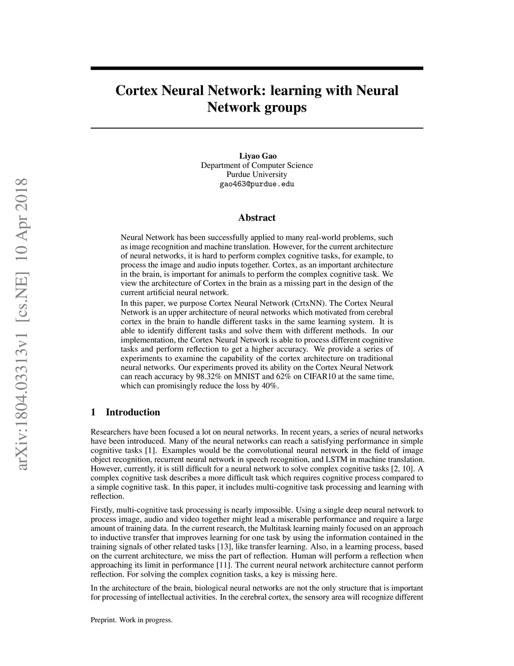 Neural Network has been successfully applied to many real-world problems, such as image recognition and machine translation. However, for the current architecture of neural networks, it is hard to perform complex cognitive tasks, for example, to process the image and audio inputs together. Cortex, as an important architecture in the brain, is important for animals to perform the complex cognitive task. We view the architecture of Cortex in the brain as a missing part in the design of the current artificial neural network. In this paper, we purpose Cortex Neural Network (CrtxNN). The Cortex Neural Network is an upper architecture of neural networks which motivated from cerebral cortex in the brain to handle different tasks in the same learning system. It is able to identify different tasks and solve them with different methods. In our implementation, the Cortex Neural Network is able to process different cognitive tasks and perform reflection to get a higher accuracy. We provide a series of experiments to examine the capability of the cortex architecture on traditional neural networks. Our experiments proved its ability on the Cortex Neural Network can reach accuracy by 98.32% on MNIST and 62% on CIFAR10 at the same time, which can promisingly reduce the loss by 40%.