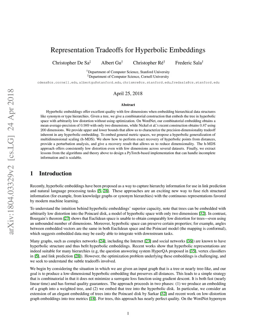 Hyperbolic embeddings offer excellent quality with few dimensions when embedding hierarchical data structures like synonym or type hierarchies. Given a tree, we give a combinatorial construction that embeds the tree in hyperbolic space with arbitrarily low distortion without using optimization. On WordNet, our combinatorial embedding obtains a mean-average-precision of 0.989 with only two dimensions, while Nickel et al.'s recent construction obtains 0.87 using 200 dimensions. We provide upper and lower bounds that allow us to characterize the precision-dimensionality tradeoff inherent in any hyperbolic embedding. To embed general metric spaces, we propose a hyperbolic generalization of multidimensional scaling (h-MDS). We show how to perform exact recovery of hyperbolic points from distances, provide a perturbation analysis, and give a recovery result that allows us to reduce dimensionality. The h-MDS approach offers consistently low distortion even with few dimensions across several datasets. Finally, we extract lessons from the algorithms and theory above to design a PyTorch-based implementation that can handle incomplete information and is scalable.