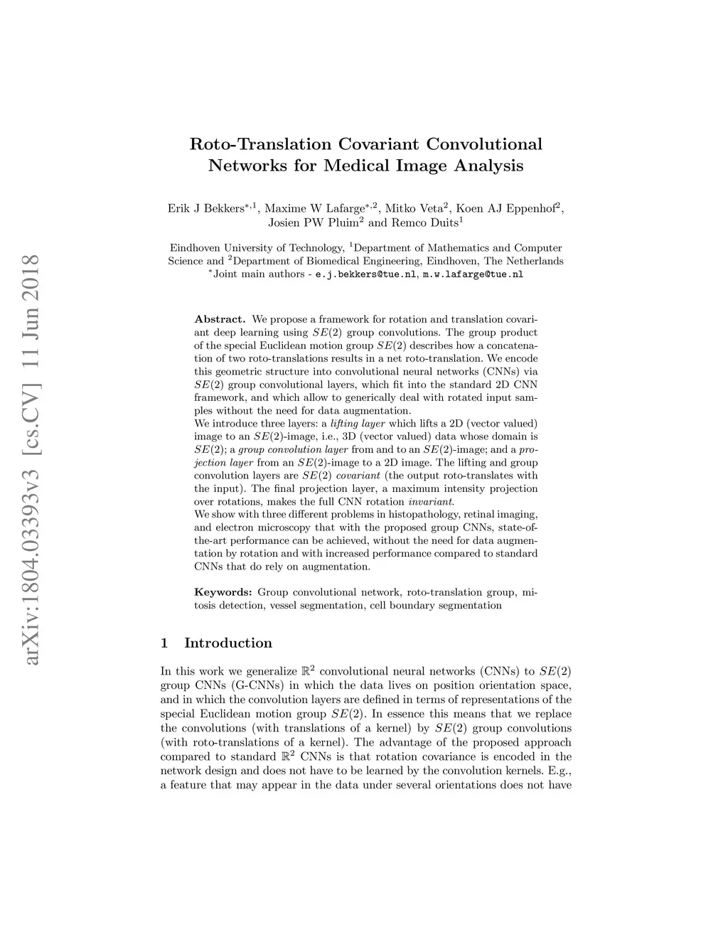 We propose a framework for rotation and translation covariant deep learning using group convolutions. The group product of the special Euclidean motion group describes how a concatenation of two roto-translations results in a net roto-translation. We encode this geometric structure into convolutional neural networks (CNNs) via group convolutional layers, which fit into the standard 2D CNN framework, and which allow to generically deal with rotated input samples without the need for data augmentation. We introduce three layers: a lifting layer which lifts a 2D (vector valued) image to an -image, i.e., 3D (vector valued) data whose domain is ; a group convolution layer from and to an -image; and a projection layer from an -image to a 2D image. The lifting and group convolution layers are covariant (the output roto-translates with the input). The final projection layer, a maximum intensity projection over rotations, makes the full CNN rotation invariant. We show with three different problems in histopathology, retinal imaging, and electron microscopy that with the proposed group CNNs, state-of-the-art performance can be achieved, without the need for data augmentation by rotation and with increased performance compared to standard CNNs that do rely on augmentation.