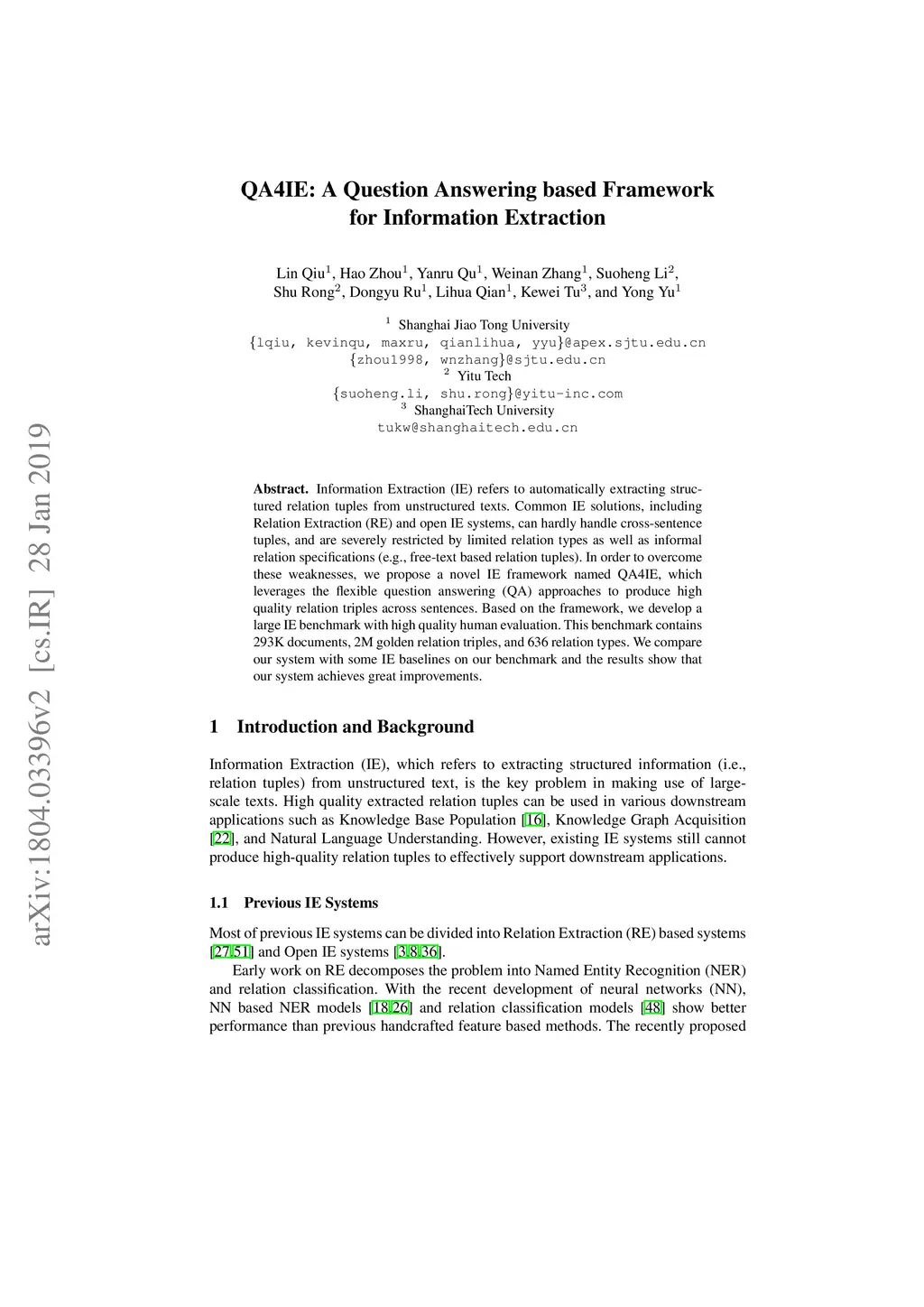 Information Extraction (IE) refers to automatically extracting structured relation tuples from unstructured texts. Common IE solutions, including Relation Extraction (RE) and open IE systems, can hardly handle cross-sentence tuples, and are severely restricted by limited relation types as well as informal relation specifications (e.g., free-text based relation tuples). In order to overcome these weaknesses, we propose a novel IE framework named QA4IE, which leverages the flexible question answering (QA) approaches to produce high quality relation triples across sentences. Based on the framework, we develop a large IE benchmark with high quality human evaluation. This benchmark contains 293K documents, 2M golden relation triples, and 636 relation types. We compare our system with some IE baselines on our benchmark and the results show that our system achieves great improvements.
