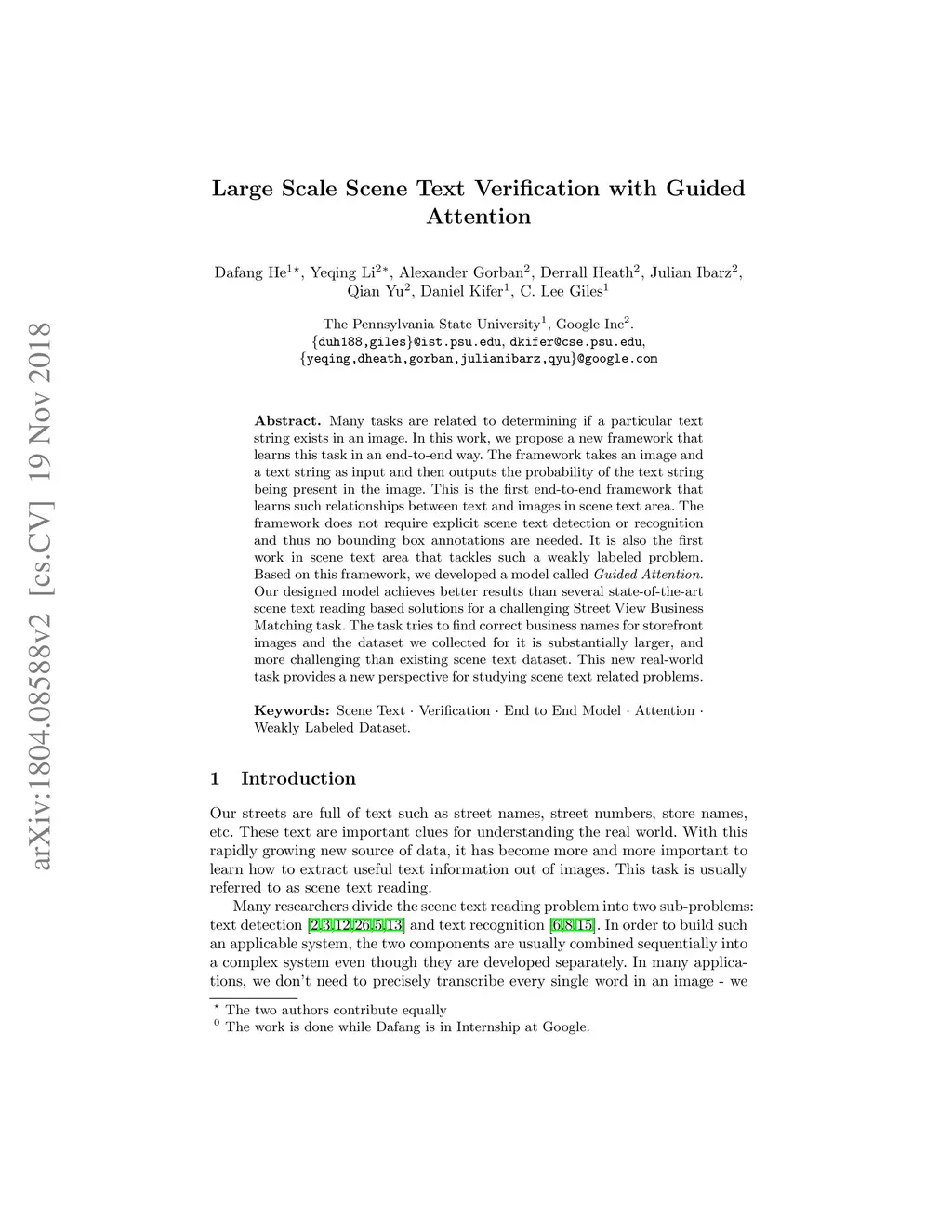 Many tasks are related to determining if a particular text string exists in an image. In this work, we propose a new framework that learns this task in an end-to-end way. The framework takes an image and a text string as input and then outputs the probability of the text string being present in the image. This is the first end-to-end framework that learns such relationships between text and images in scene text area. The framework does not require explicit scene text detection or recognition and thus no bounding box annotations are needed for it. It is also the first work in scene text area that tackles suh a weakly labeled problem. Based on this framework, we developed a model called Guided Attention. Our designed model achieves much better results than several state-of-the-art scene text reading based solutions for a challenging Street View Business Matching task. The task tries to find correct business names for storefront images and the dataset we collected for it is substantially larger, and more challenging than existing scene text dataset. This new real-world task provides a new perspective for studying scene text related problems. We also demonstrate the uniqueness of our task via a comparison between our problem and a typical Visual Question Answering problem.