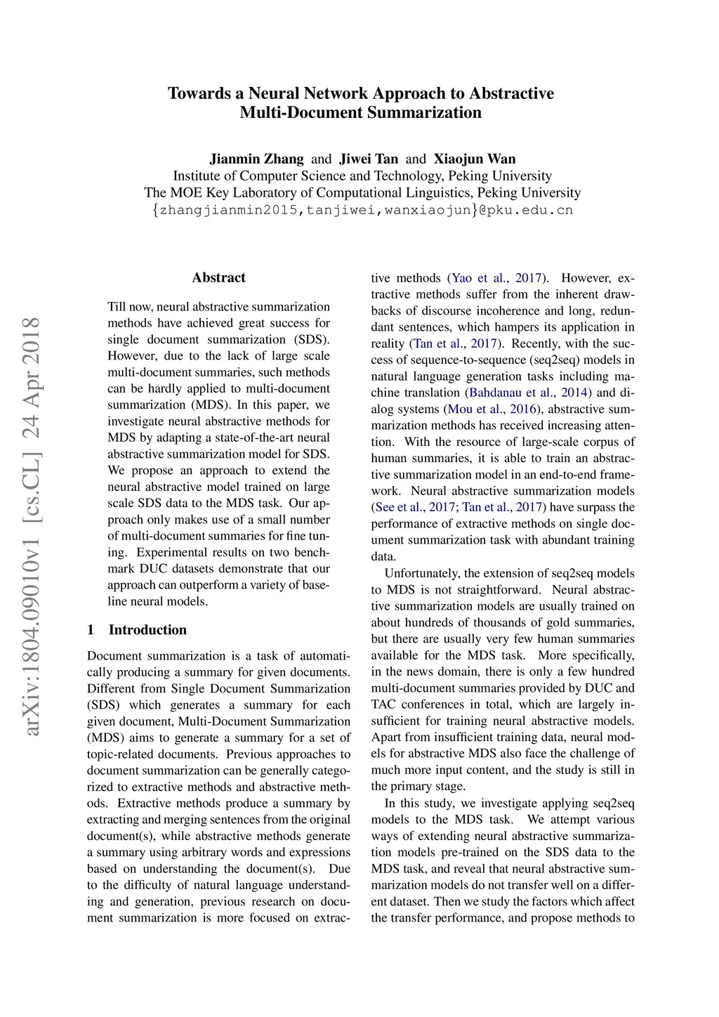Towards a Neural Network Approach to Abstractive Multi-Document