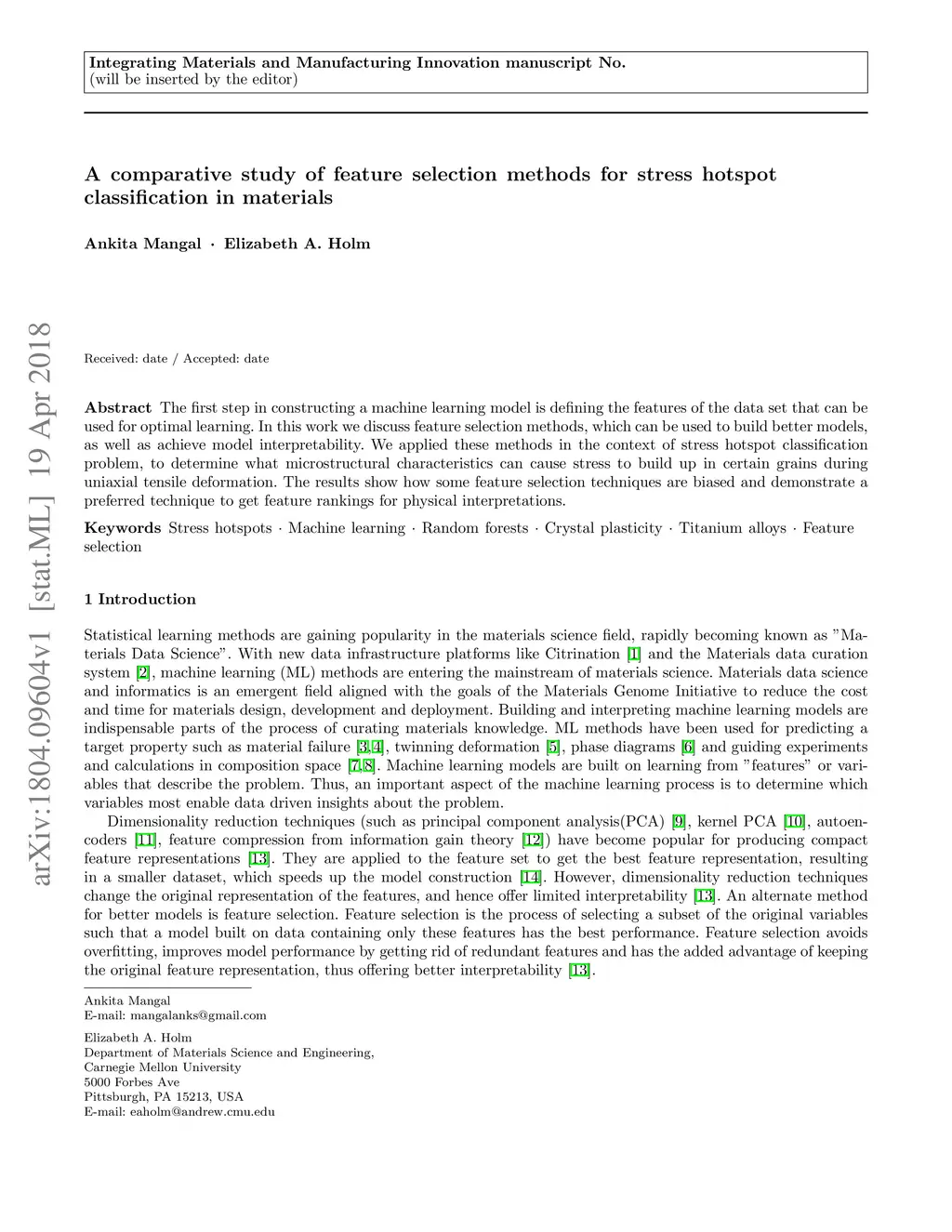 The first step in constructing a machine learning model is defining the features of the data set that can be used for optimal learning. In this work we discuss feature selection methods, which can be used to build better models, as well as achieve model interpretability. We applied these methods in the context of stress hotspot classification problem, to determine what microstructural characteristics can cause stress to build up in certain grains during uniaxial tensile deformation. The results show how some feature selection techniques are biased and demonstrate a preferred technique to get feature rankings for physical interpretations.