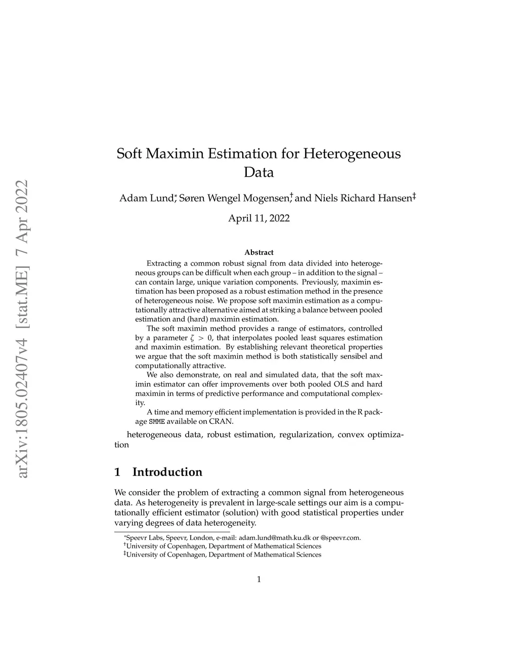 Extracting a common robust signal from data divided into heterogeneous groups can be difficult when each group -- in addition to the signal -- can contain large, unique variation components. Previously, maximin estimation has been proposed as a robust estimation method in the presence of heterogeneous noise. We propose soft maximin estimation as a computationally attractive alternative aimed at striking a balance between pooled estimation and (hard) maximin estimation. The soft maximin method provides a range of estimators, controlled by a parameter , that interpolates pooled least squares estimation and maximin estimation. By establishing relevant theoretical properties we argue that the soft maximin method is both statistically sensibel and computationally attractive. We also demonstrate, on real and simulated data, that the soft maximin estimator can offer improvements over both pooled OLS and hard maximin in terms of predictive performance and computational complexity. A time and memory efficient implementation is provided in the R package \verb+SMME+ available on CRAN.