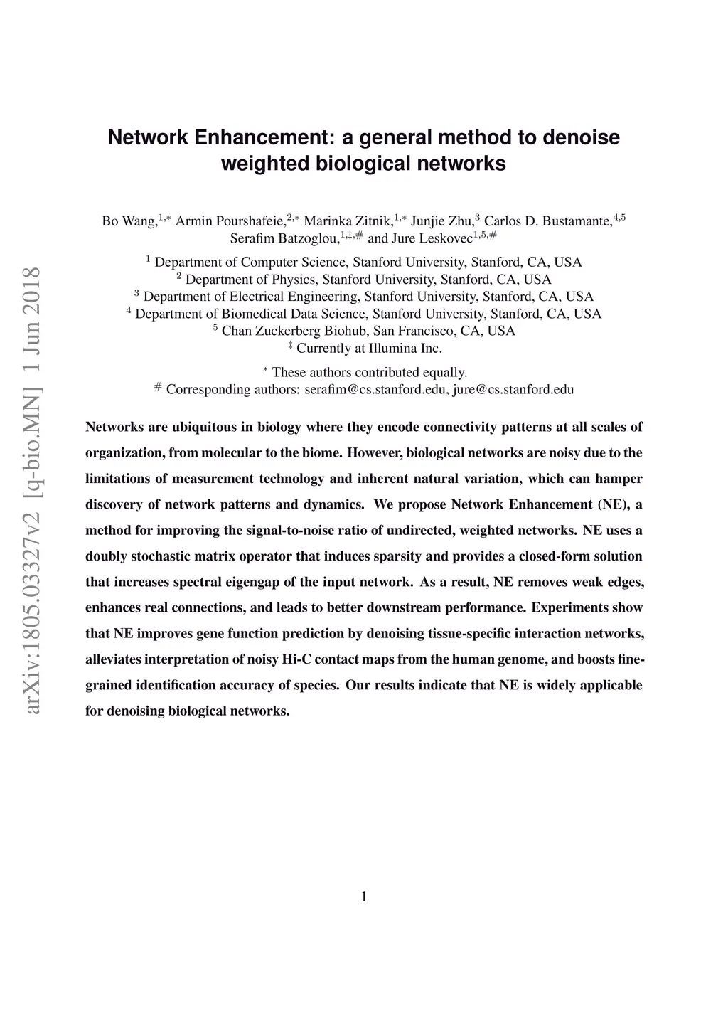Networks are ubiquitous in biology where they encode connectivity patterns at all scales of organization, from molecular to the biome. However, biological networks are noisy due to the limitations of measurement technology and inherent natural variation, which can hamper discovery of network patterns and dynamics. We propose Network Enhancement (NE), a method for improving the signal-to-noise ratio of undirected, weighted networks. NE uses a doubly stochastic matrix operator that induces sparsity and provides a closed-form solution that increases spectral eigengap of the input network. As a result, NE removes weak edges, enhances real connections, and leads to better downstream performance. Experiments show that NE improves gene function prediction by denoising tissue-specific interaction networks, alleviates interpretation of noisy Hi-C contact maps from the human genome, and boosts fine-grained identification accuracy of species. Our results indicate that NE is widely applicable for denoising biological networks.